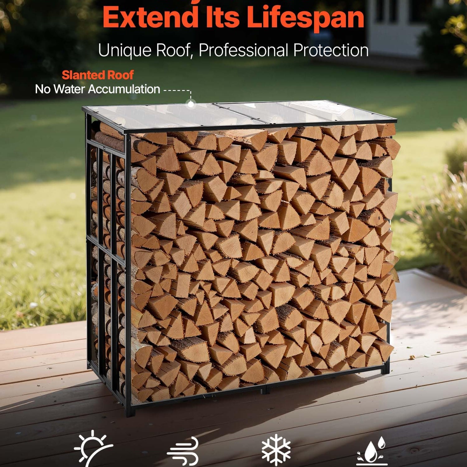 - Weatherproof Polycarbonate Roof: This outdoor wood rack comes with polycarbonate panels that are impact-resistant and UV-stabilized. The roof can withstand harsh weather, offering long-lasting protection for your firewood.