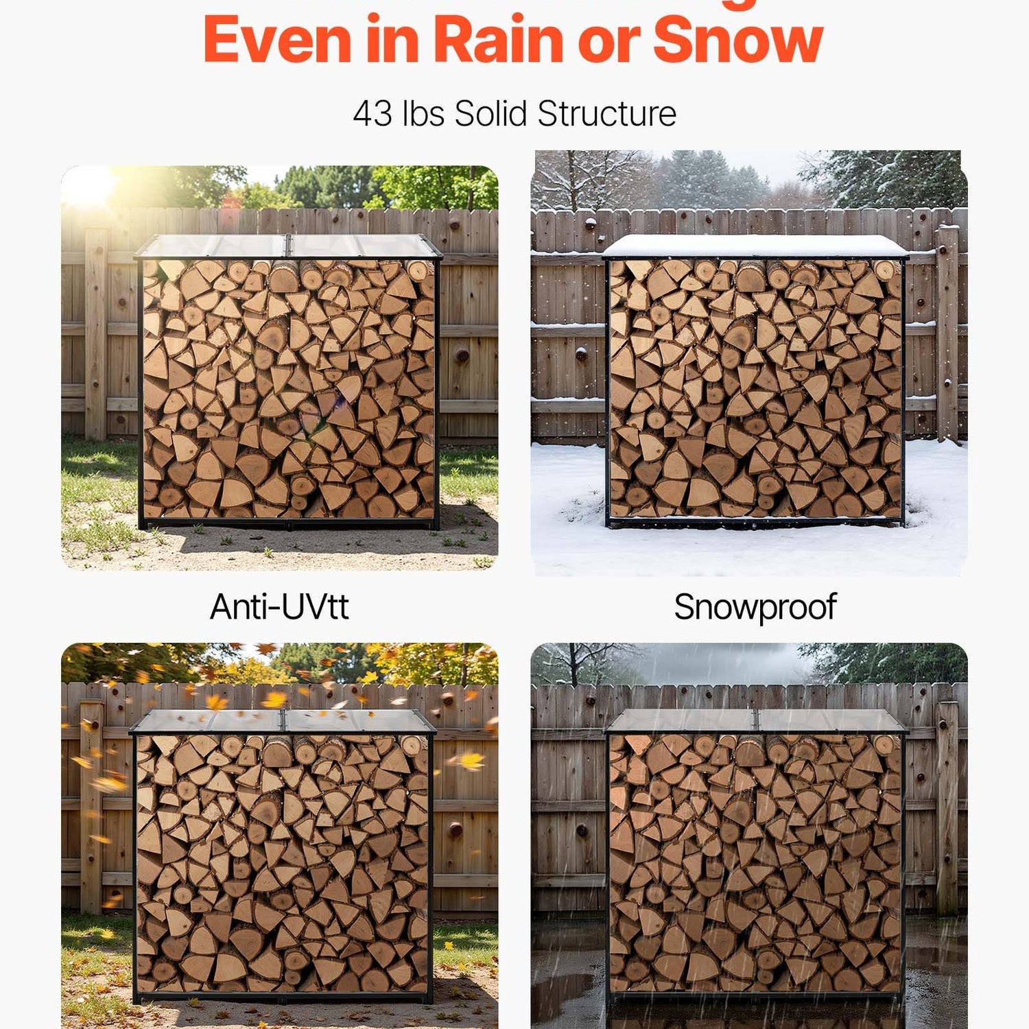 - Stable Free-Standing Design: With a weight of 43 lbs, this metal wood stand features a stable structure with adjustable leveling feet. It remains steady even in snow-heavy or rainy regions—ideal for various outdoor environments.
