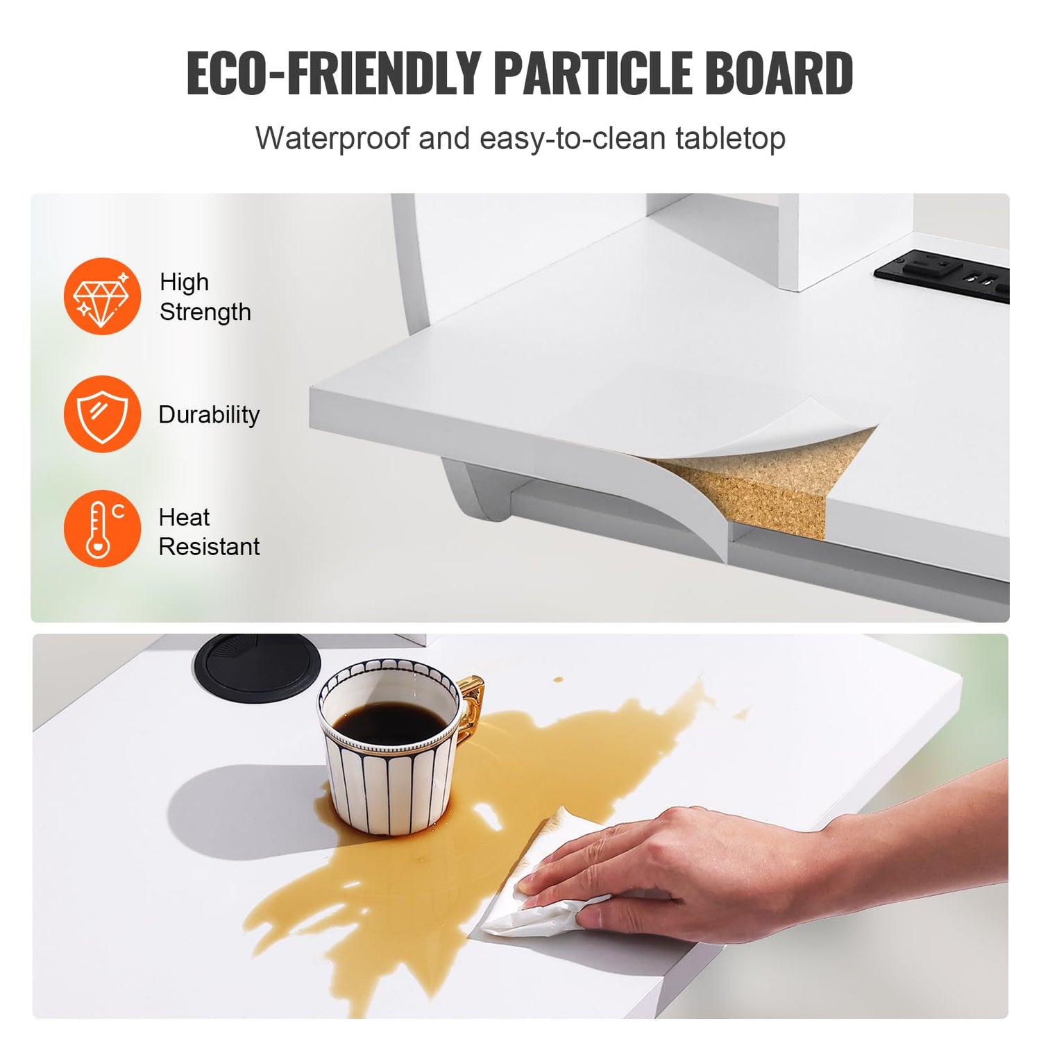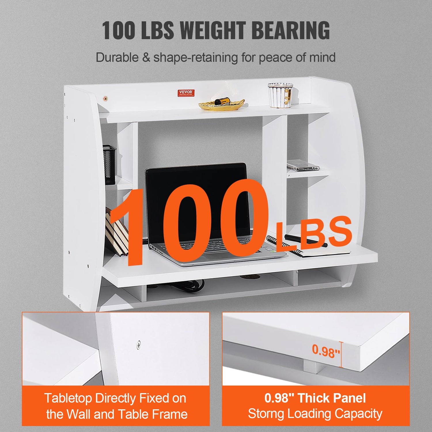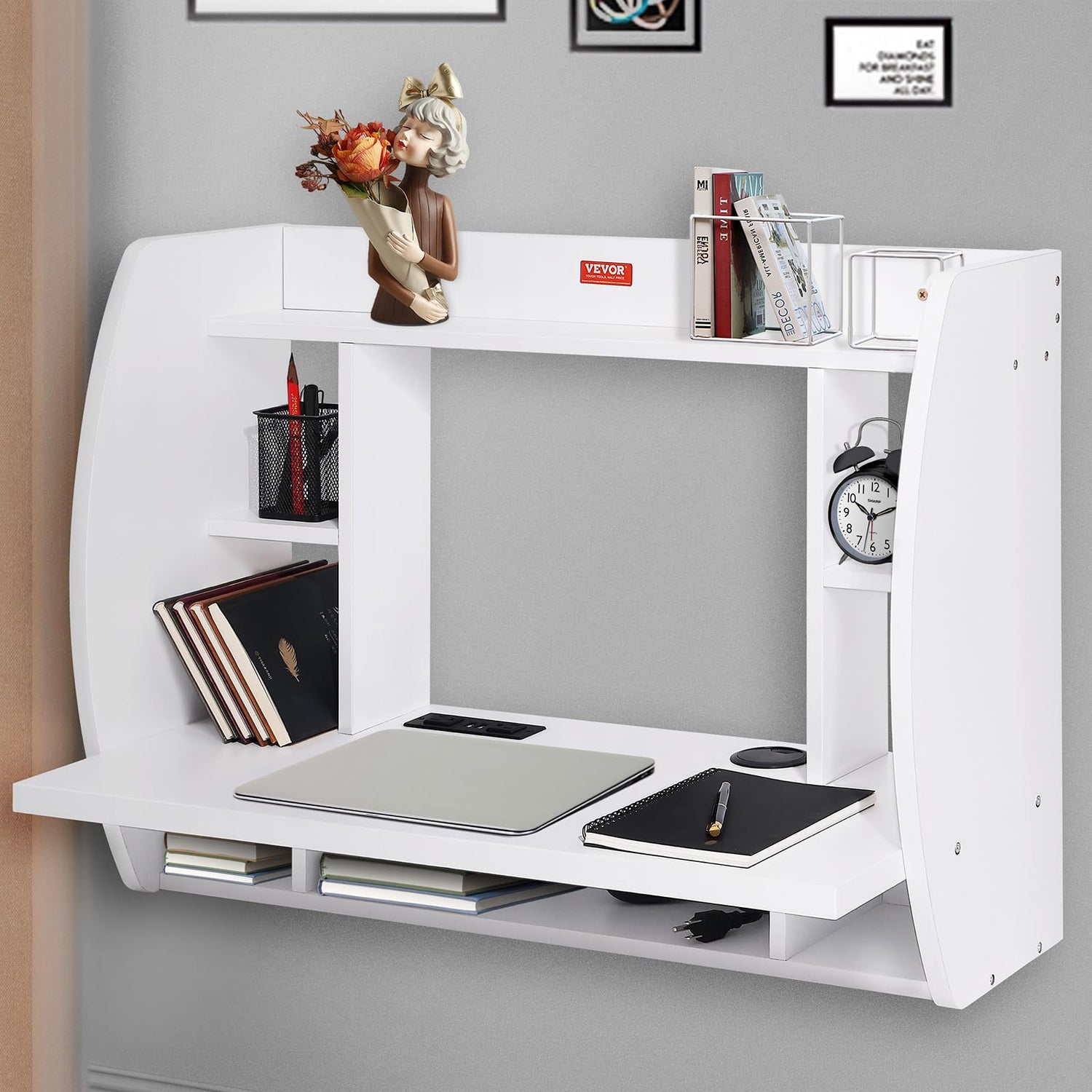 VEVOR Floating Wall Mount Computer Desk Socket and 70.9 in (1.8 m) Power Cord for Home Office, Space Saving with Storage Shelves and Cubby, White