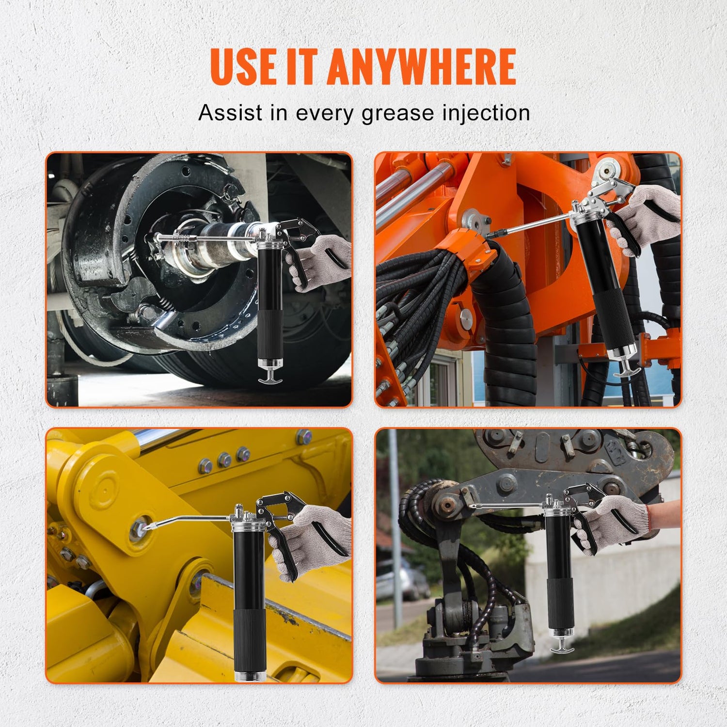 VEVOR Grease Gun, 6000 PSI Heavy Duty Pistol Grip Grease Gun, Grease Gun Kit with 14 oz Load, 17.72 Inch Flexible Hose, 1 Flat Couplers, 1 Pointed Coupler, and 1 Bent Metal Pipe