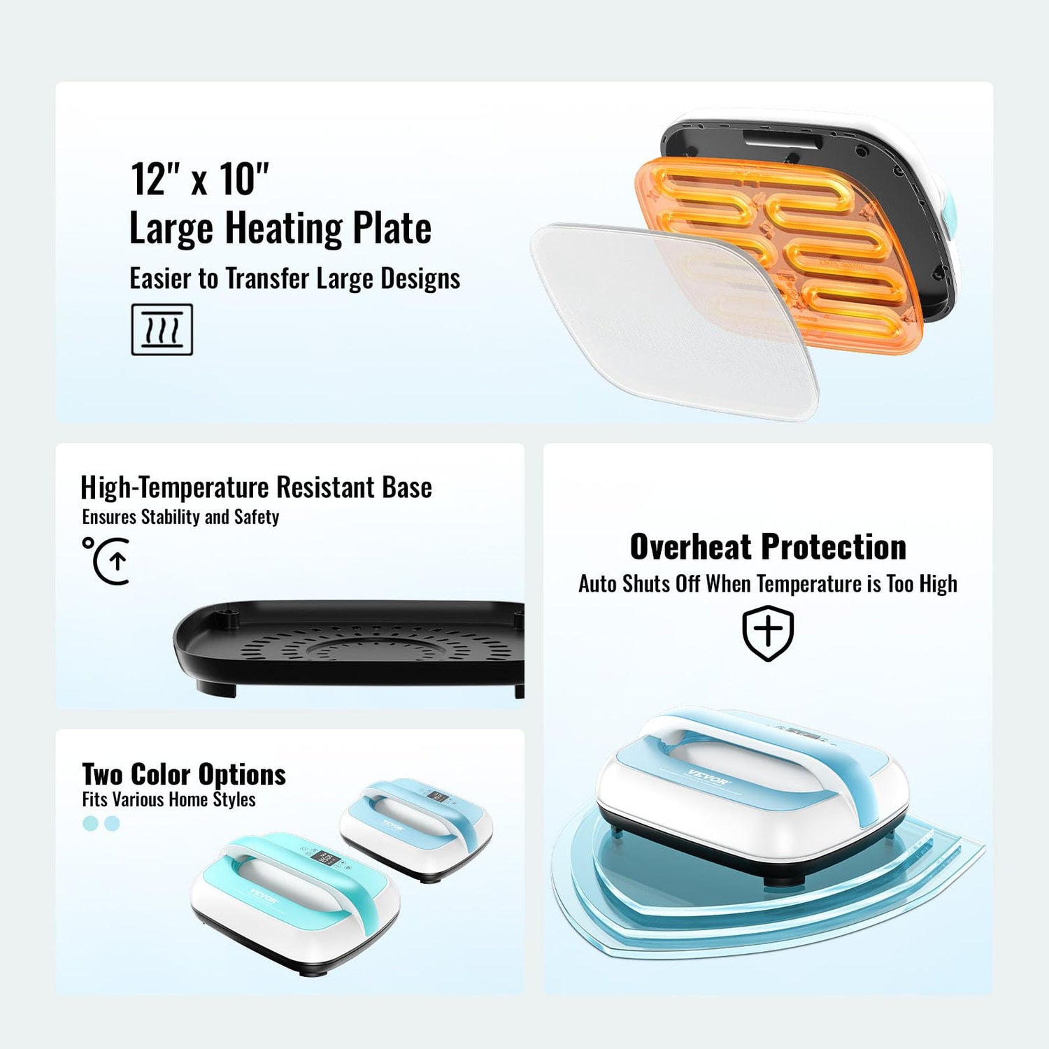 VEVOR Heat Press Machine - 12" x 10" Portable Heat Press - Heat Transfer Machine with Precise Temp Control and Auto-Off Dual-Tube Even Heating - Sublimation Machine for T-Shirts/Bags(Blue+White)