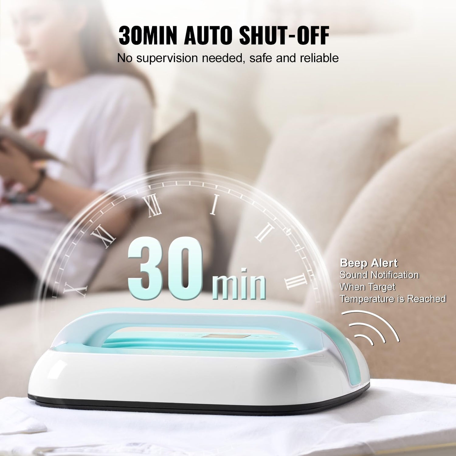 - Secure & Thoughtful Features: Our shirt press has a 30-minute auto shut-off function for added peace of mind—no worries about forgetting to turn it off. The high-temperature-resistant base withstands heat to ensure stability during use and protects your workspace.