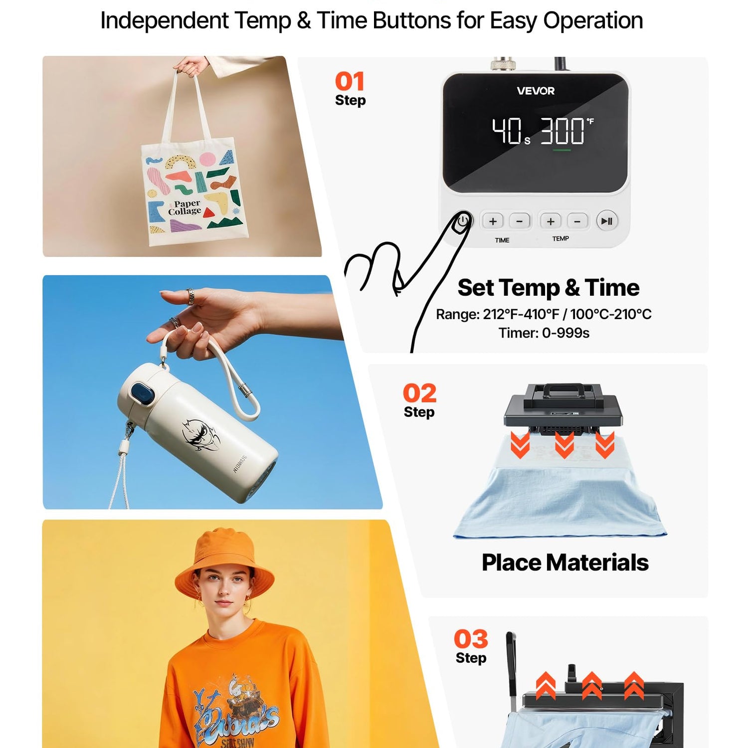 - Easy to Operate: The newly upgraded time/temp independent control panel makes the heat transfer machine simple to use. Just set the temp, place the material, press down, and you're done. Beginners can easily get started and create quickly