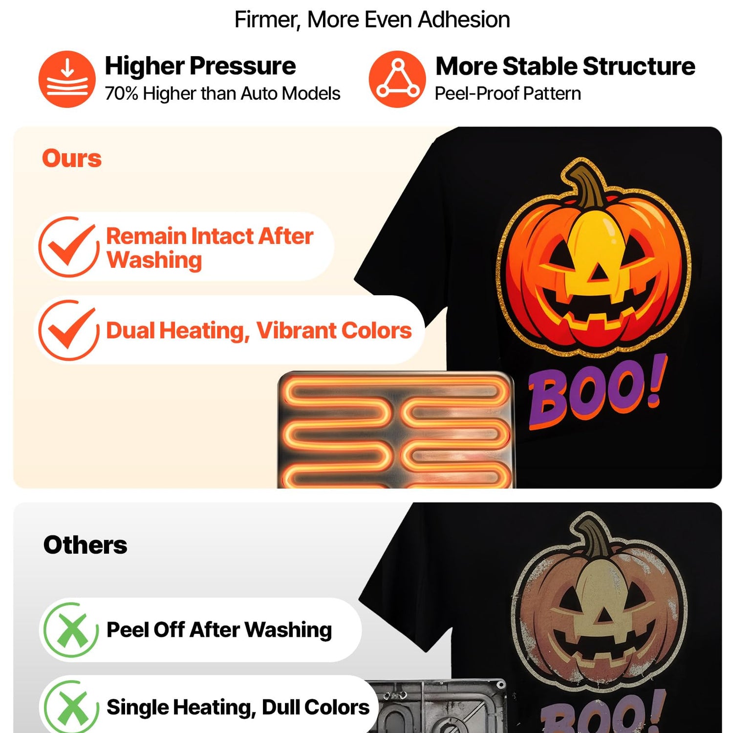 - Superior Heat Pressing: The 15 x 15 in heat press features 70% higher pressure than automatic models, surpassing even traditional ones. Its new high-stability design ensures even pressure distribution for superior results and clearer long-lasting patterns