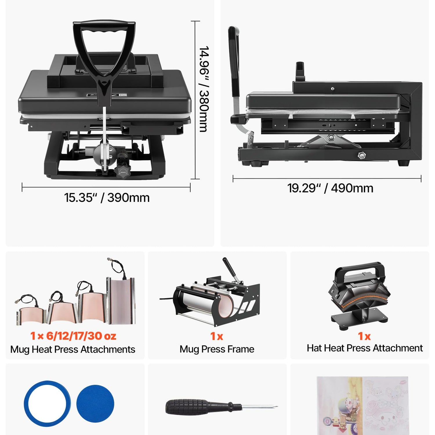 VEVOR Heat Press Machine, 15 x 15 inch, 8-in-1 Multifunction, Heat Up Fast and Even, All-New Patented Design, Easy to Control, Sublimation Press Machine for T-Shirts/Mugs/Tumblers/Caps/Plates, Black