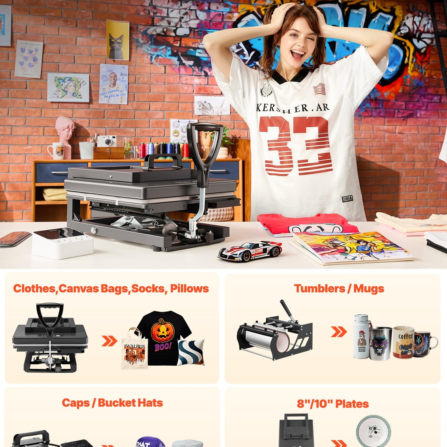 - Get More, Spend Less: This 8-in-1 heat press machine handles T-shirts, hoodies, bags, pillows, caps, mugs, plates, and more. Save space and cost with one machine. Ideal for creating presents for family or clients, blending creativity and practicality