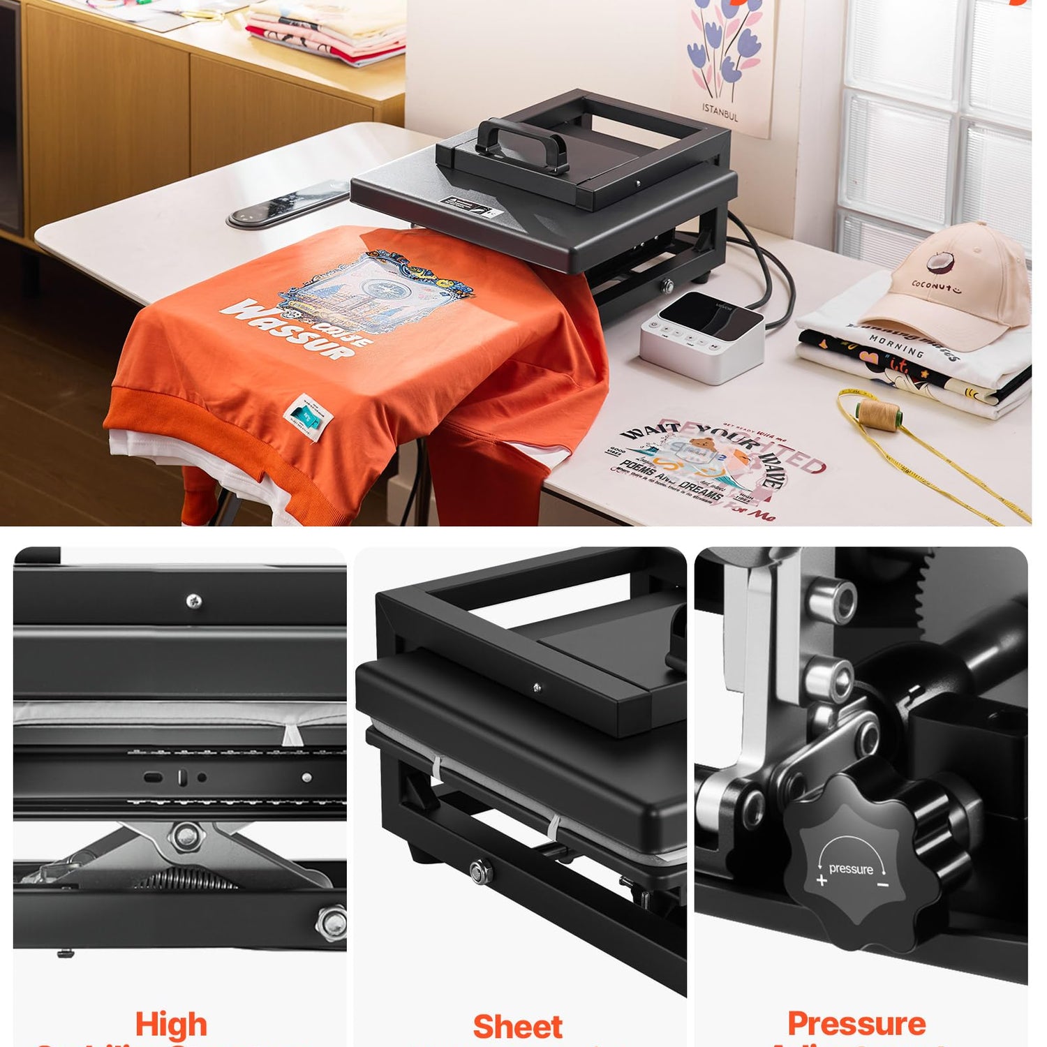 The 15 x 15 inch heat press with adjustable pressure provides precise control, ideal for materials like T-shirts and mugs. Achieve flawless heat transfer results effortlessly.