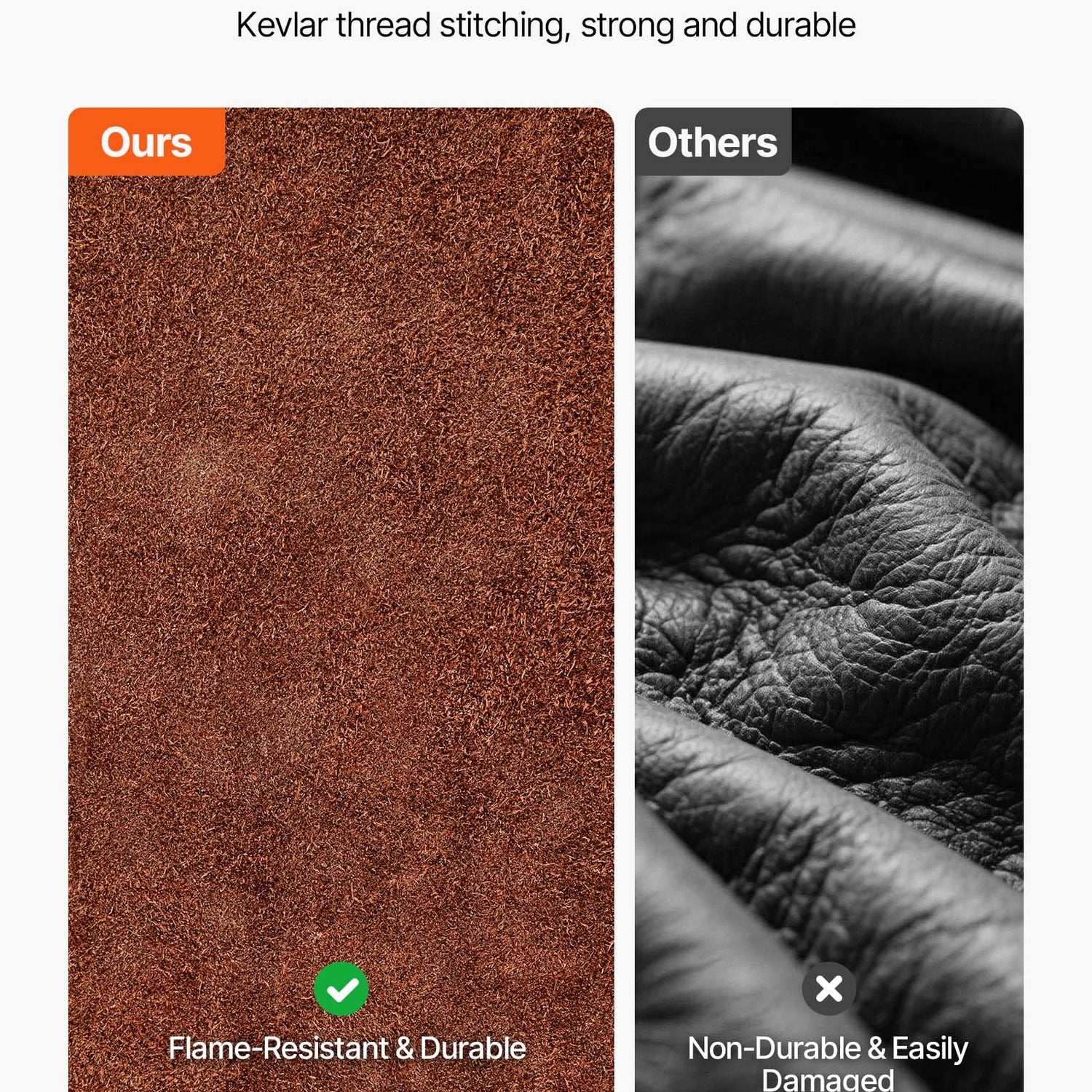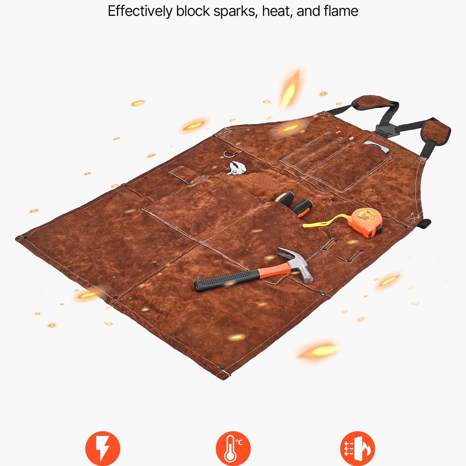 - Heavy Duty Leather: Crafted from heavy-duty full cowhide leather, and sewn with strong, flame-resistant Kevlar thread, VEVOR welding work apron ensures high durability and reliable protection, protecting you from sparks, flames, heat and fire hazards