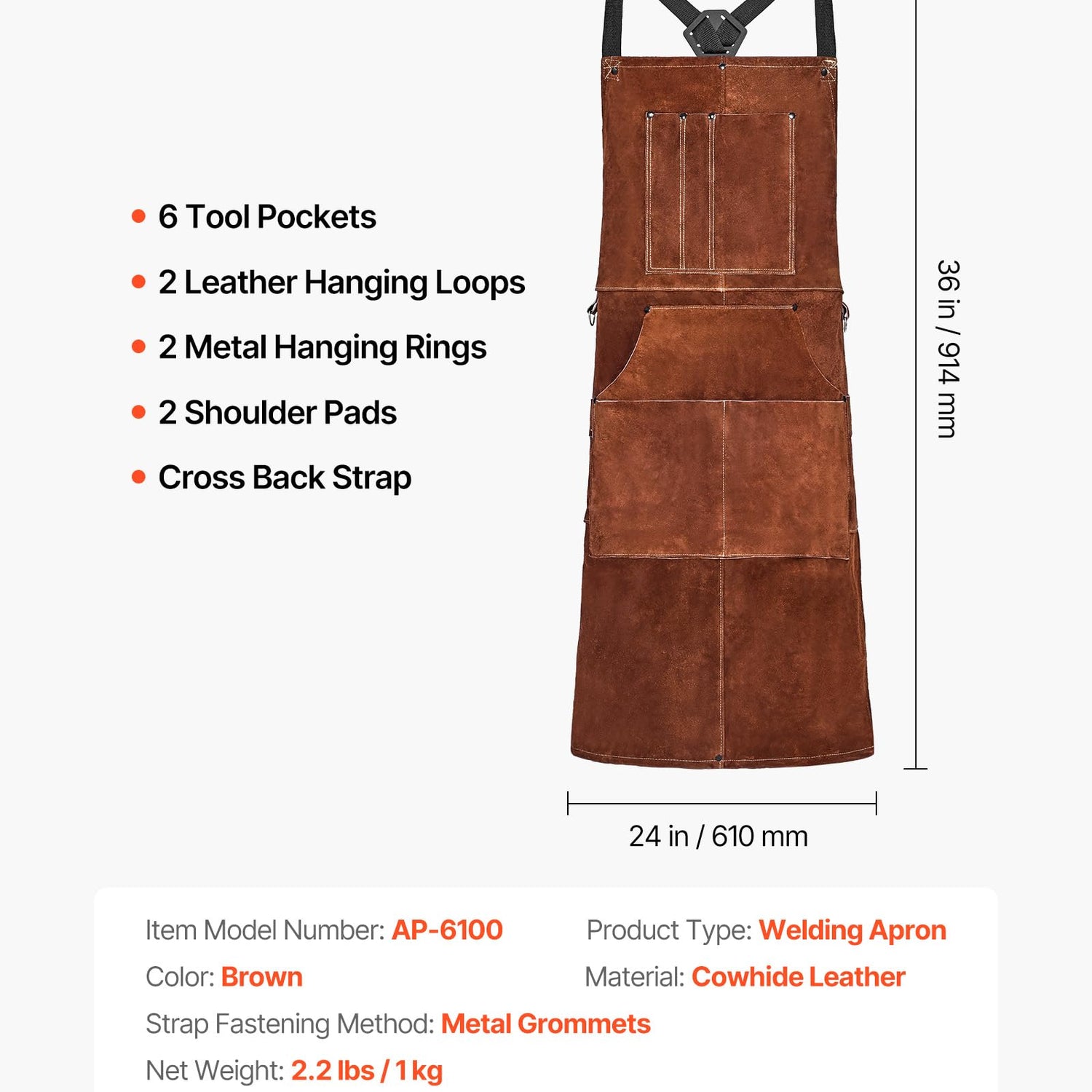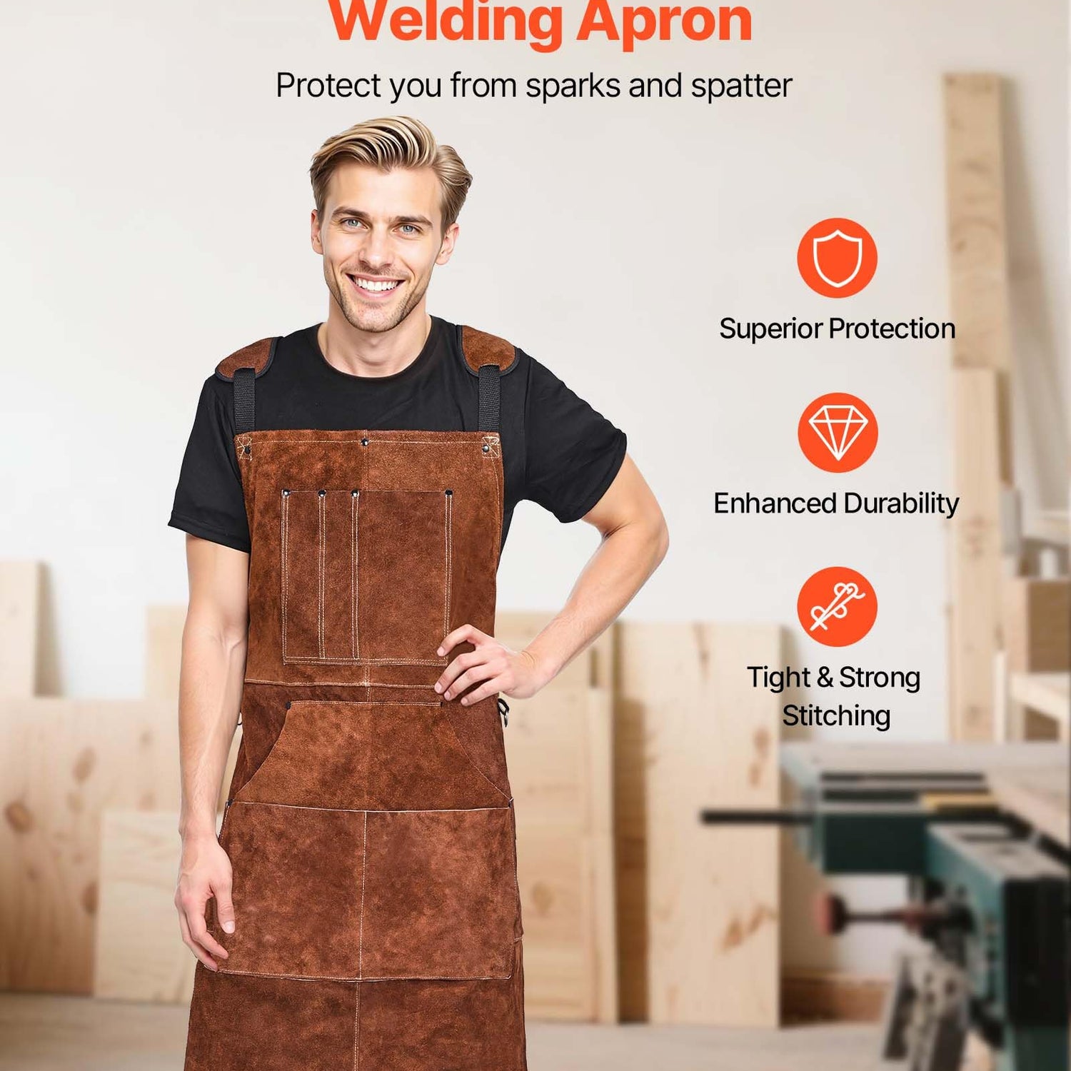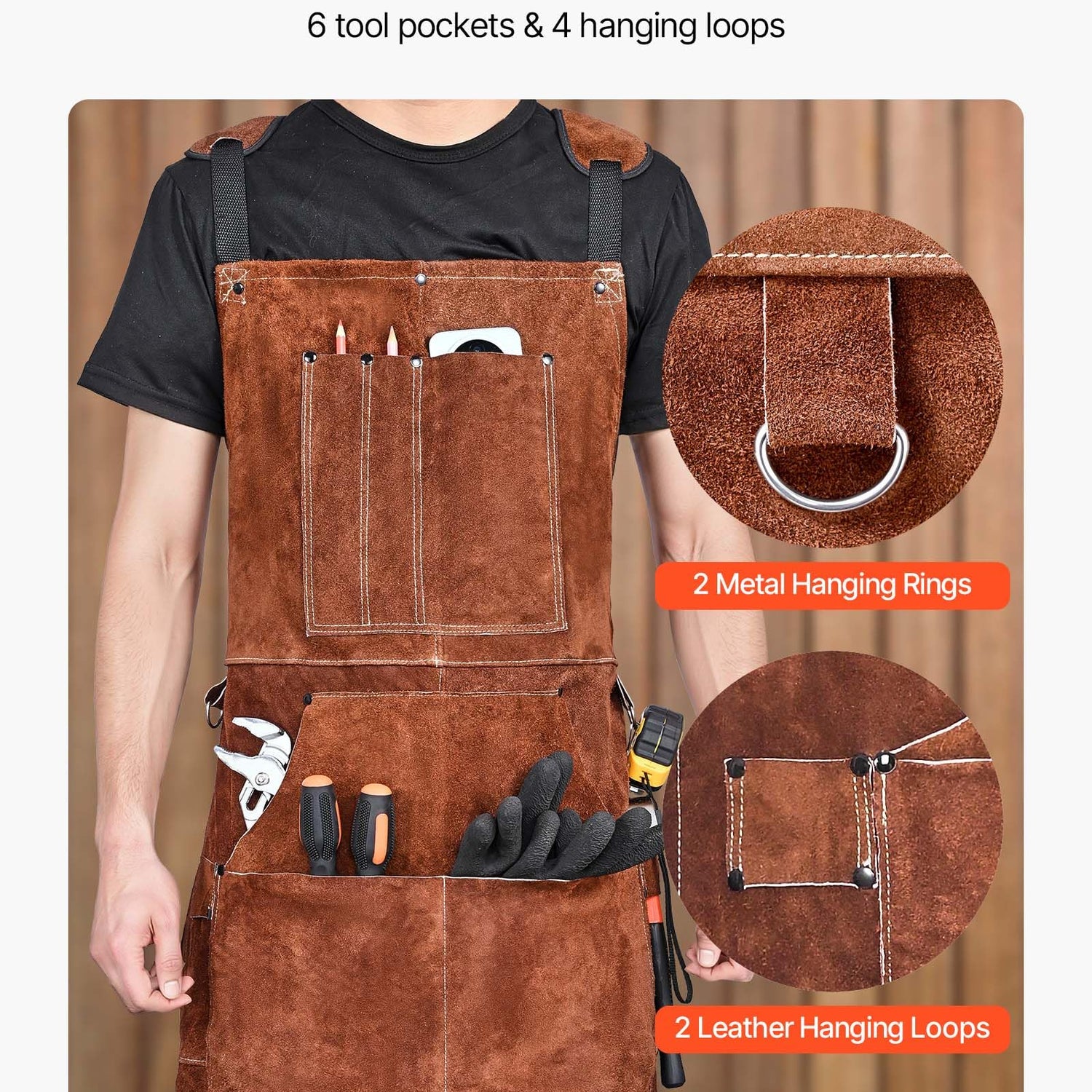 VEVOR Leather Welding Work Apron, Heavy Duty Cowhide Flame Resistant Welding Apron, Heat-Resistant Blacksmith Welder Aprons with 6 Tool Pockets for Woodworking, Gardening, BBQ