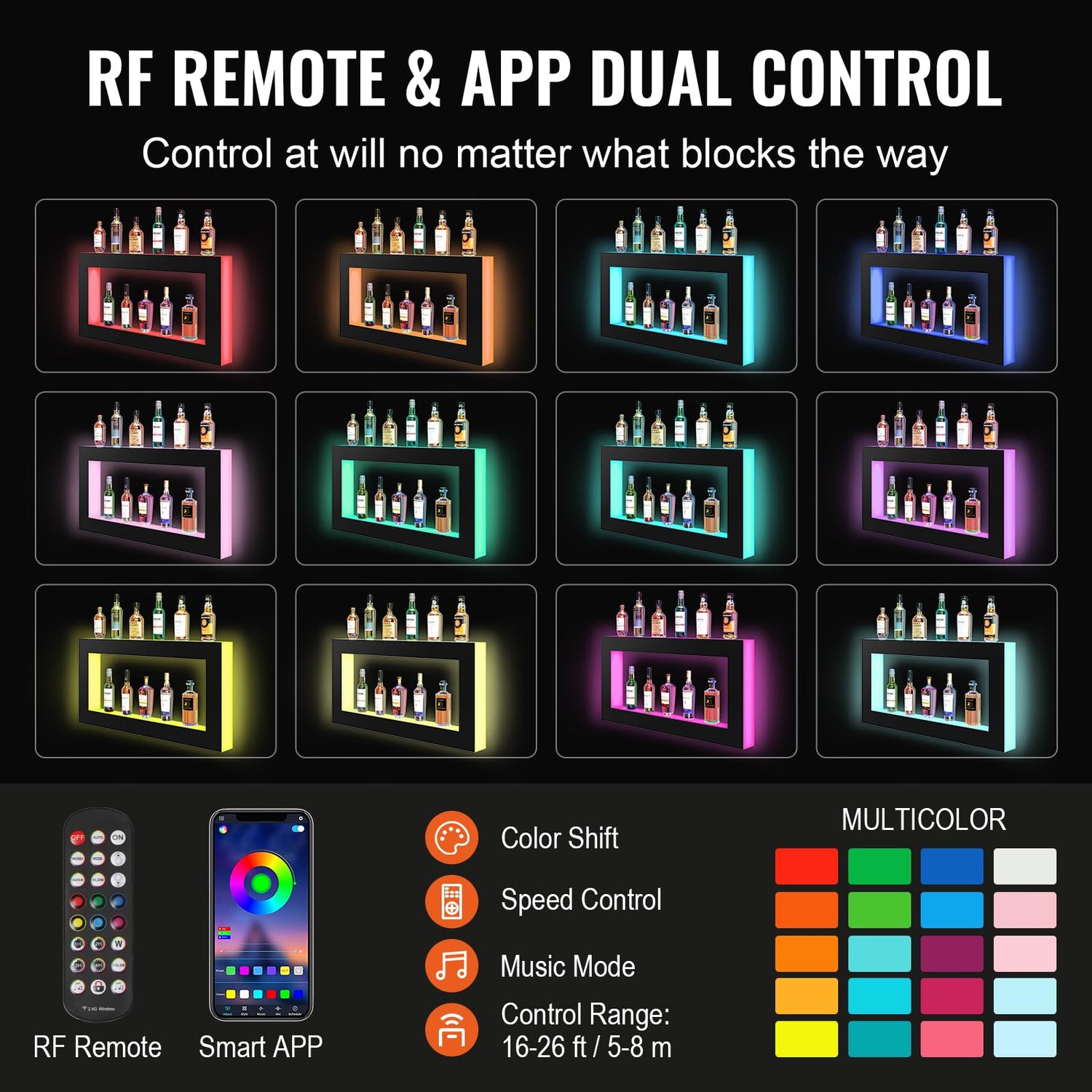 VEVOR LED Lighted Liquor Bottle Display Shelf, Square 48 Inches, Supports USB,Illuminated Home Bar Shelf w/RF Remote & App Control 7 Static Colors 1-4 H Timing, Acrylic Wall-Mounted Shelf