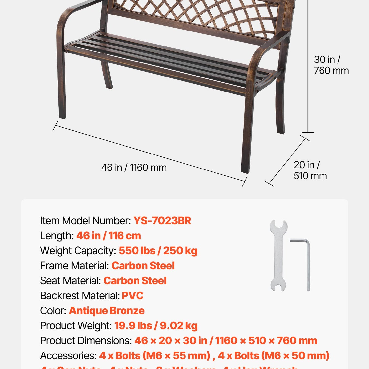 VEVOR Outdoor Bench, 46 inch, Carbon Steel Metal Frame with PVC Mesh Pattern Backrest and Round Edge Armrests, Weatherproof Outside Bench for Patio, Garden, Park, Yard, Front Porch, Antique Bronze