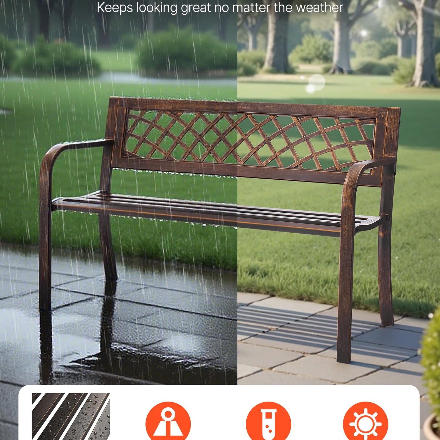 - Built for the Outdoors: This outdoor bench features a premium steel frame and durable PVC backrest that withstands sun, rain, and snow without cracking, warping, or corroding. Solid and stable, it's made to last and provides reliable support