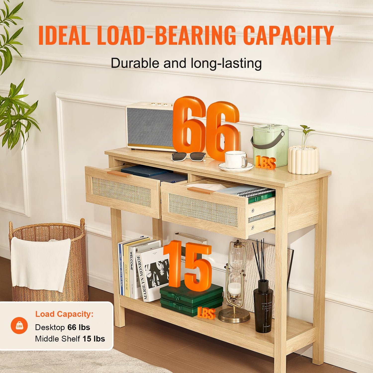 VEVOR Rattan Console Table with 2 Storage Drawers, Rattan Entryway Table with Natural Rattan Sliding Door, Console Sofa Table for Living Room, Study, Entryway Or TV Wall, Natural