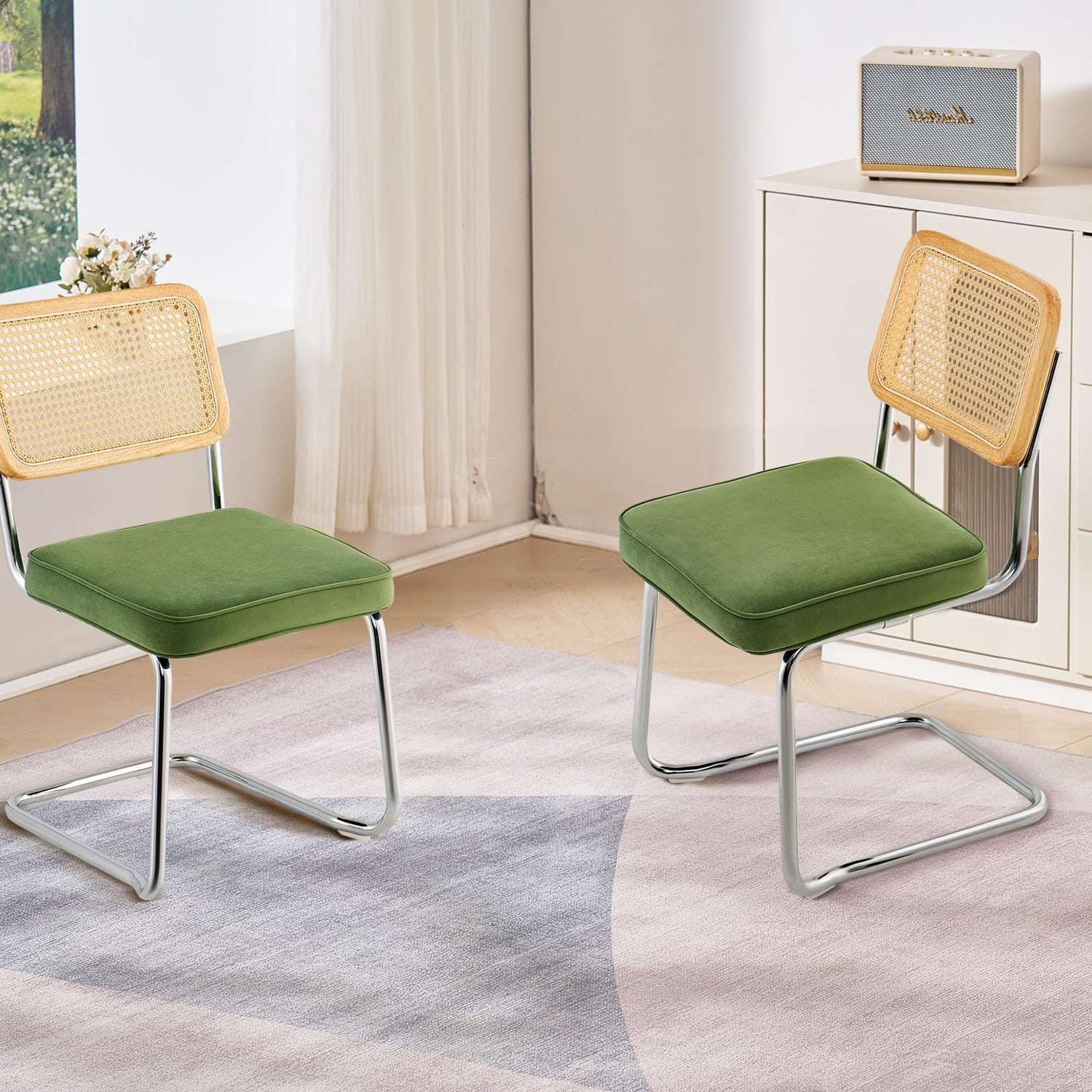 VEVOR Rattan Dining Chairs Set of 2, Mid Century Modern Dining Chair, Upholstered Velvet Accent Chair with Rattan Back, Retro Dining Room Kitchen Chair for Living Room, Bedroom (18.1 Inch)