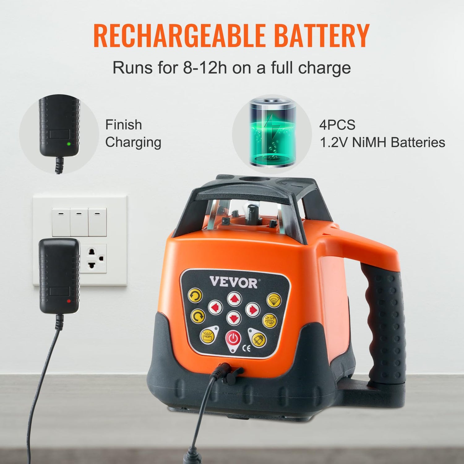 - Rechargeable Battery: Are you ready to dive into power? Our level laser tool is powered by 4PCS 1.2V NiMH batteries that run for 8–12 hours on a full charge (including charger), ensuring that you'll be able to complete your tasks efficiently without the need to frequently recharge or replace batteries when things matter most.