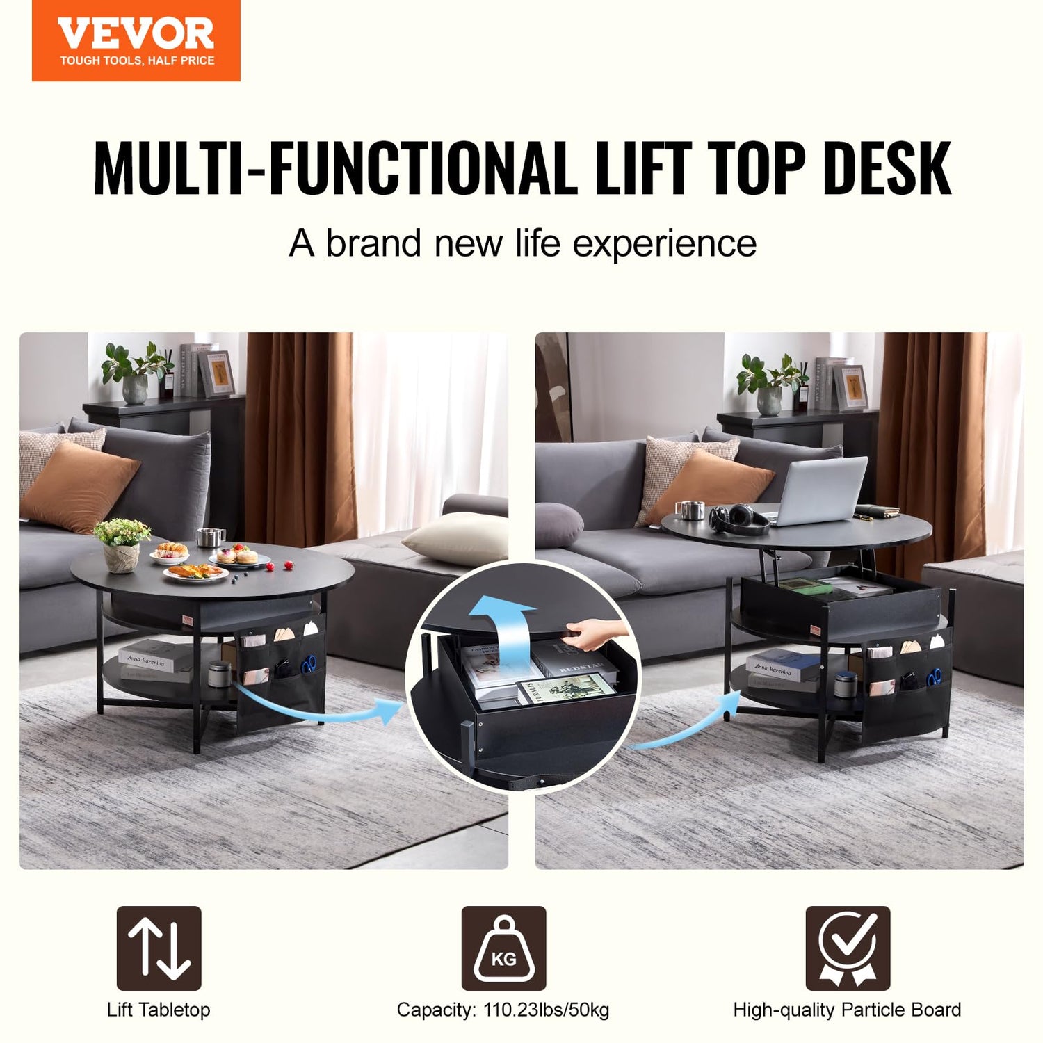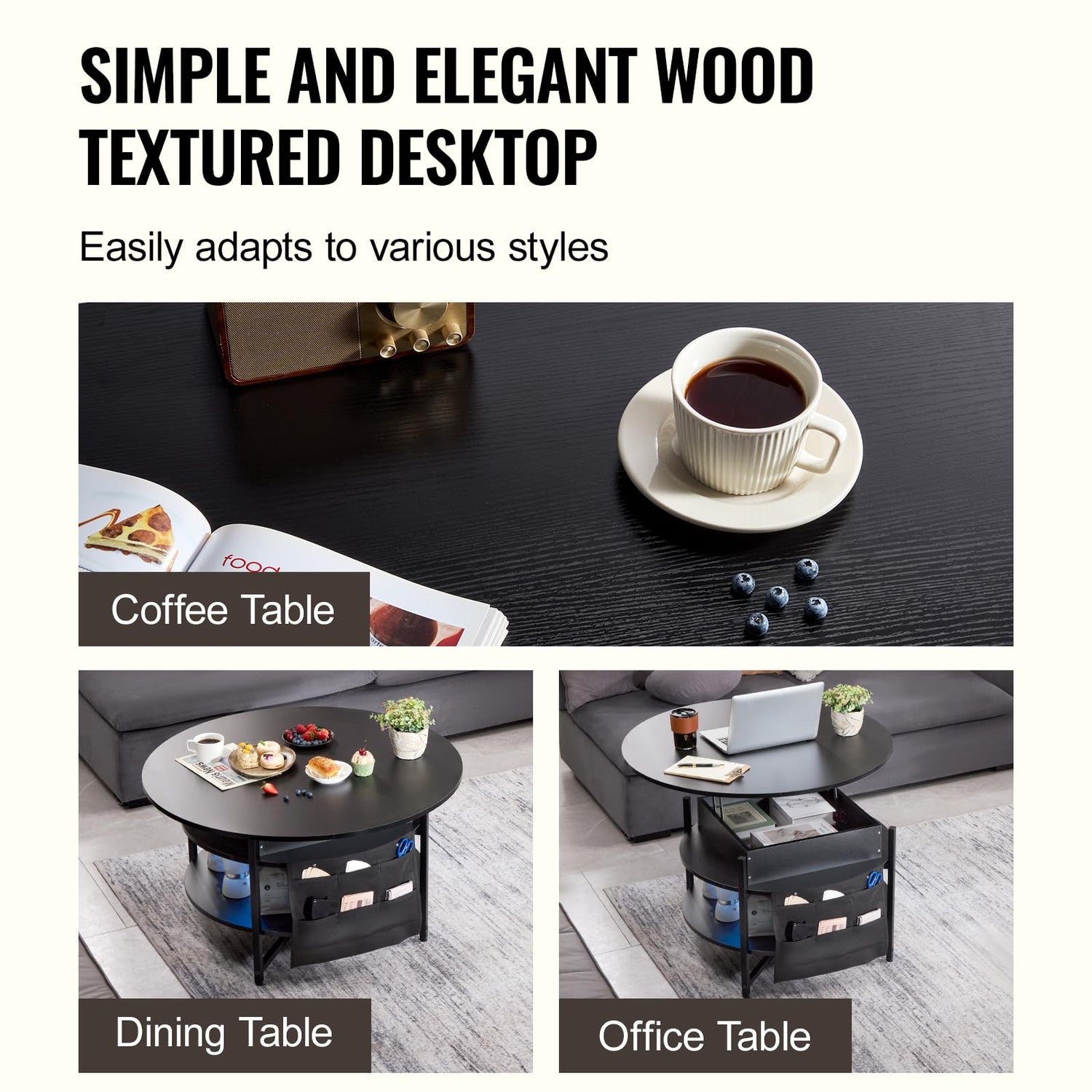 VEVOR Round Lift Top Coffee Table for Living Room, 35.3 in Round Coffee Table with Storage and Hidden Compartment, Circle Coffee Table with LED Light, Black