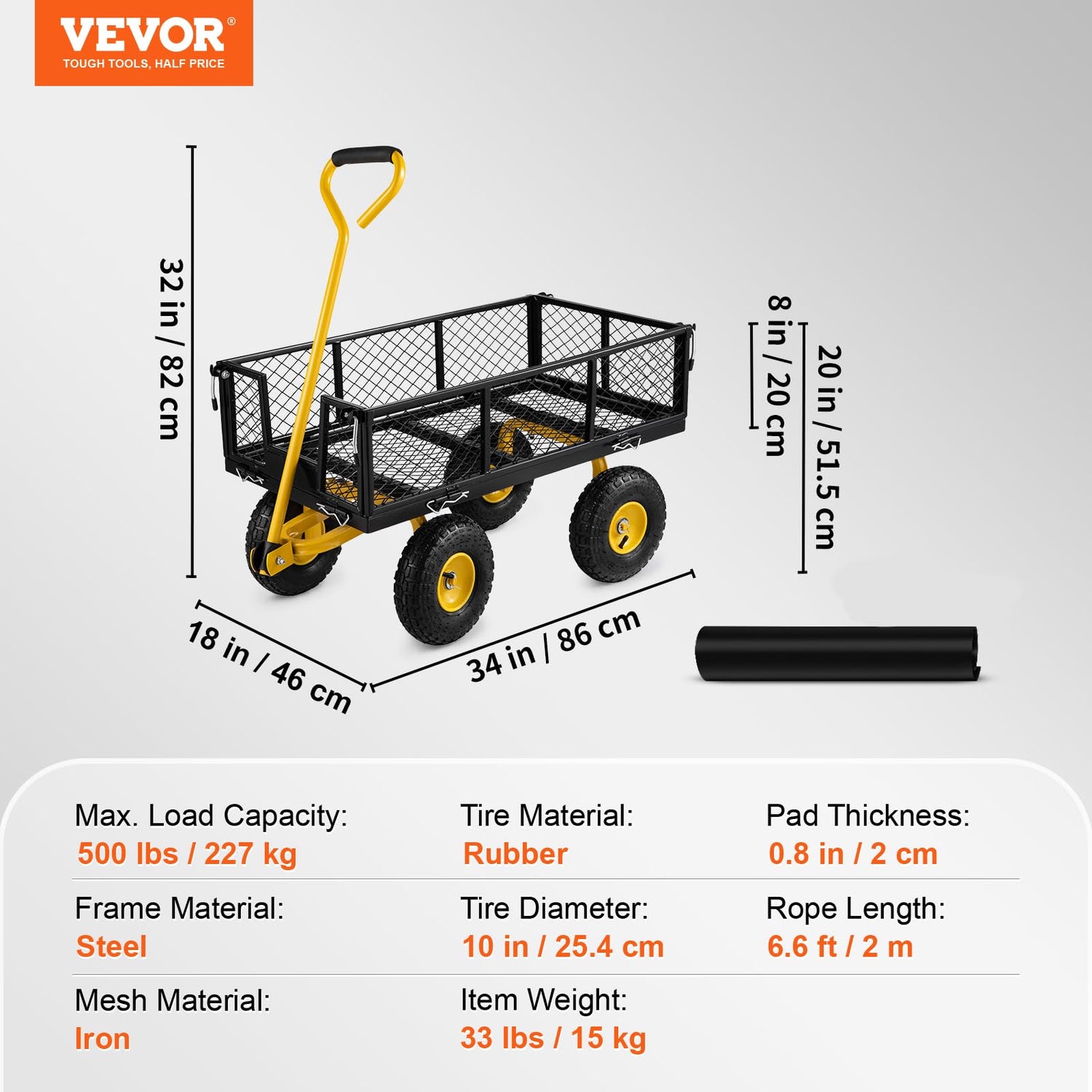 - LARGE CAPACITY GARDEN CART: VEVOR's multi-functional garden wagon will become your number 1 assistant for garden planting. It will solve all problems when transporting equipment weighing up to 500 lbs. This garden carts has a steel mesh bed that is 34 in long and 18 in wide, carrying large amounts of planting tools with ease. and balanced 4-wheeled design makes tackling heavy landscaping projects or garden projects a breeze