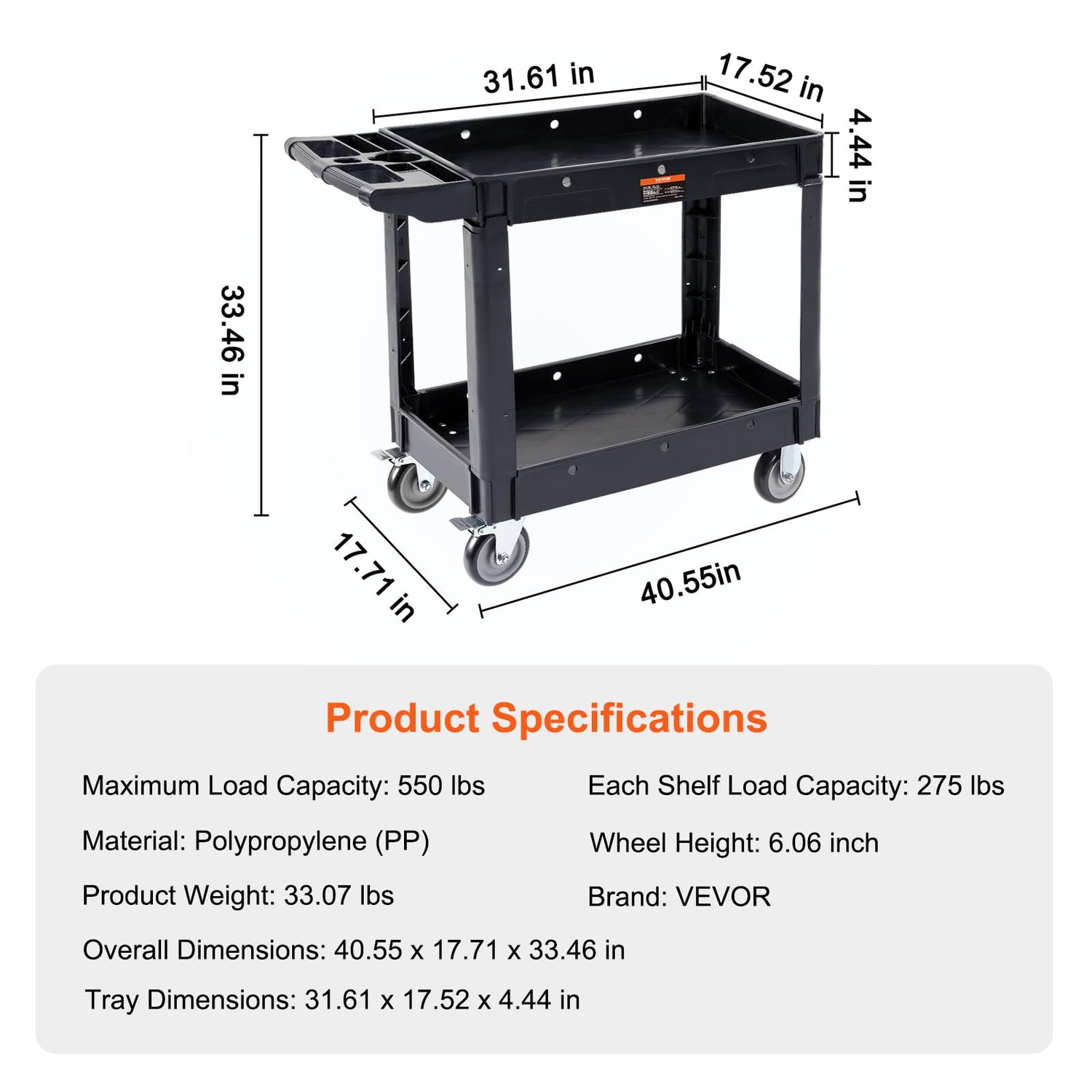 - 【Strong Weight Capacity】VEVOR 2-tier utility cart can effortless transport 550 lbs heavy loads, such as oversized cartons, large filing cabinets, and hefty toolboxes. Quality polypropylene material is corrosion-resistant, impervious to debris, and easy to clean. High-density structural foam construction makes this cart utility cart sturdy, lightweight, and maneuverable, ideal for long-term heavy-duty transportation needs.