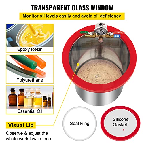 - High Sealing Transparent Lid:The chamber’s transparent window is convenient for detecting oil levels and preventing the motor from burning due to oil shortages. This high-quality chamber is perfect for degassing urethanes, silicone, epoxies, extracting essential oil, resin casting, and wood stabilizing. Know your machine inside and out and feel the difference from competitors; power and efficiency you can see and feel.