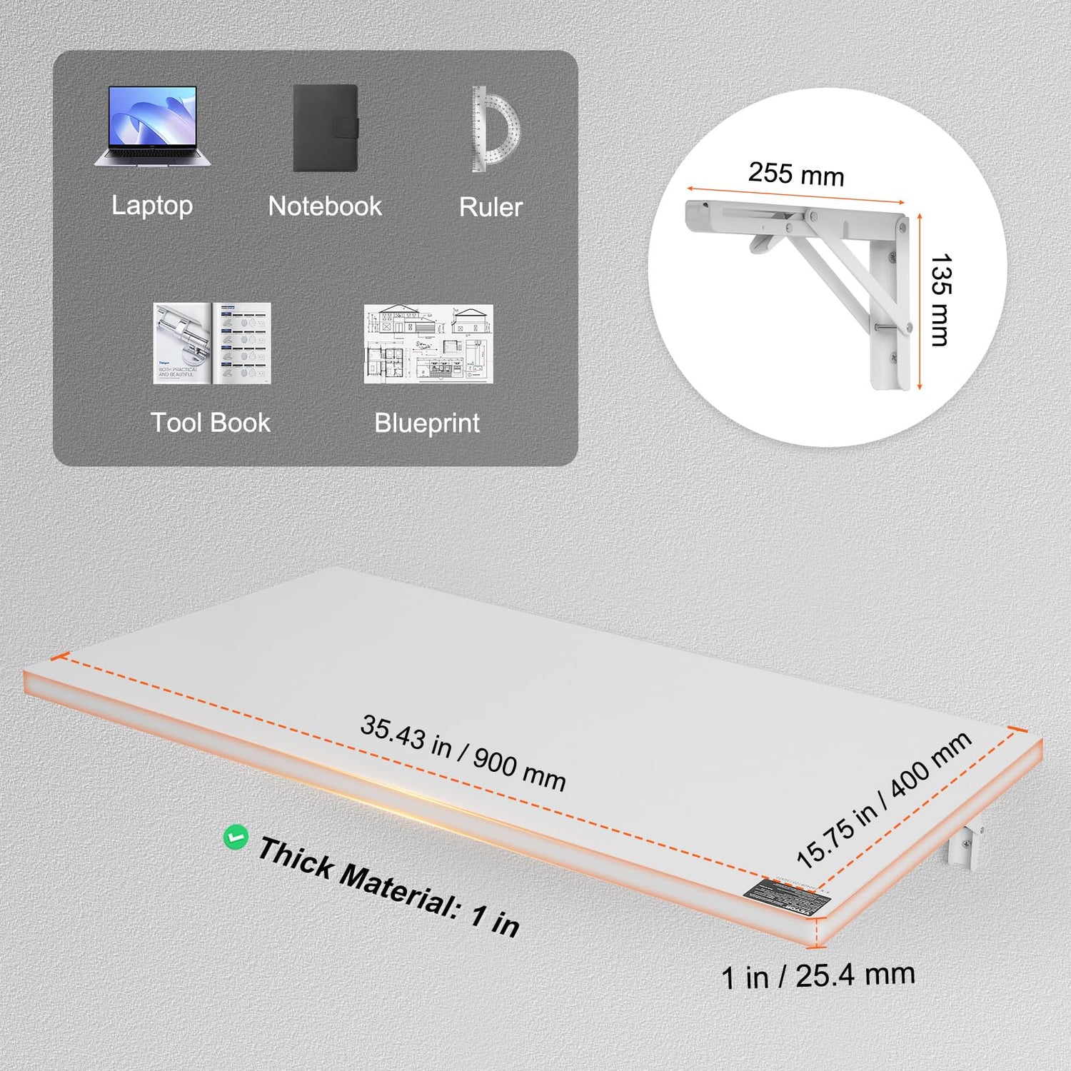 VEVOR Wall Mounted Folding Table, 35.43" x 19.69" Wall Mount Drop Leaf Table, Floating Desk with Iron Bracket, Fold Down Desk for Small Spaces, Home Office, Dining, Laundry Room, Kitchen, Bar, White