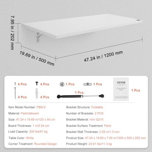 Specification Item Model Number: PBS-6 Material: Particleboard Size: 47.24 x 19.69 in/1200 x 500 mm Board Thickness: 1 in/25.4 mm Load Capacity: 200 lbs/91 kg Bracket Material: Iron Q215 Bracket Surface Treatment: Paint Product Size (Unfolded): 47.24 x 19.69 x 7.95 in/1200 x 500 x 202 mm Product Weight: 24.91 lbs/11.3 kg