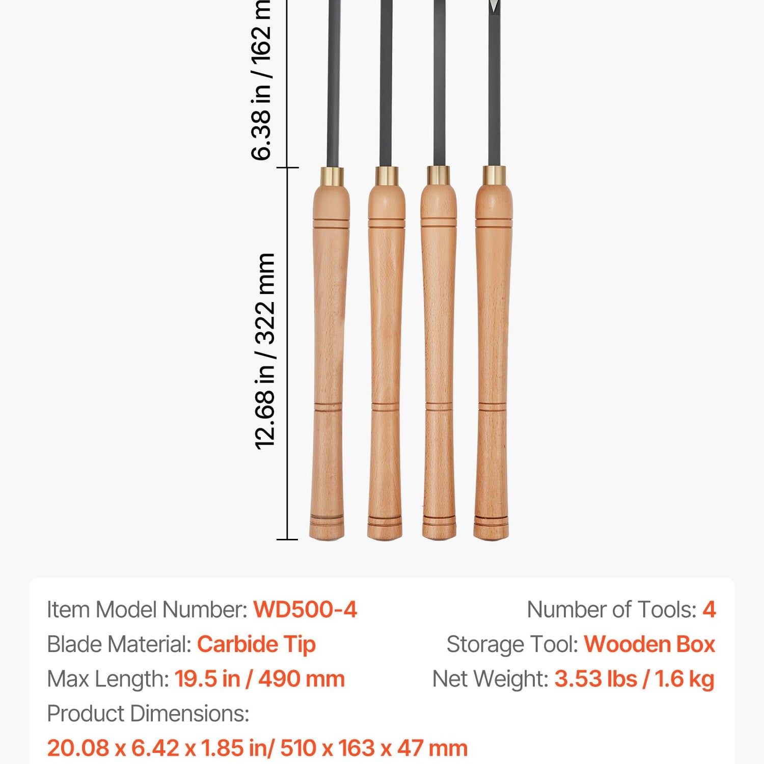 Specification Item Model Number: WD500-4 Number of Tools: 4 Blade Material: Carbide Tip Storage Tool: Wooden Box Max Length: 19.5 in/490 mm Net Weight: 3.53 lbs/1.6 kg Product Dimensions: 20.08 x 6.42 x 1.85 in/510 x 163 x 47 mm