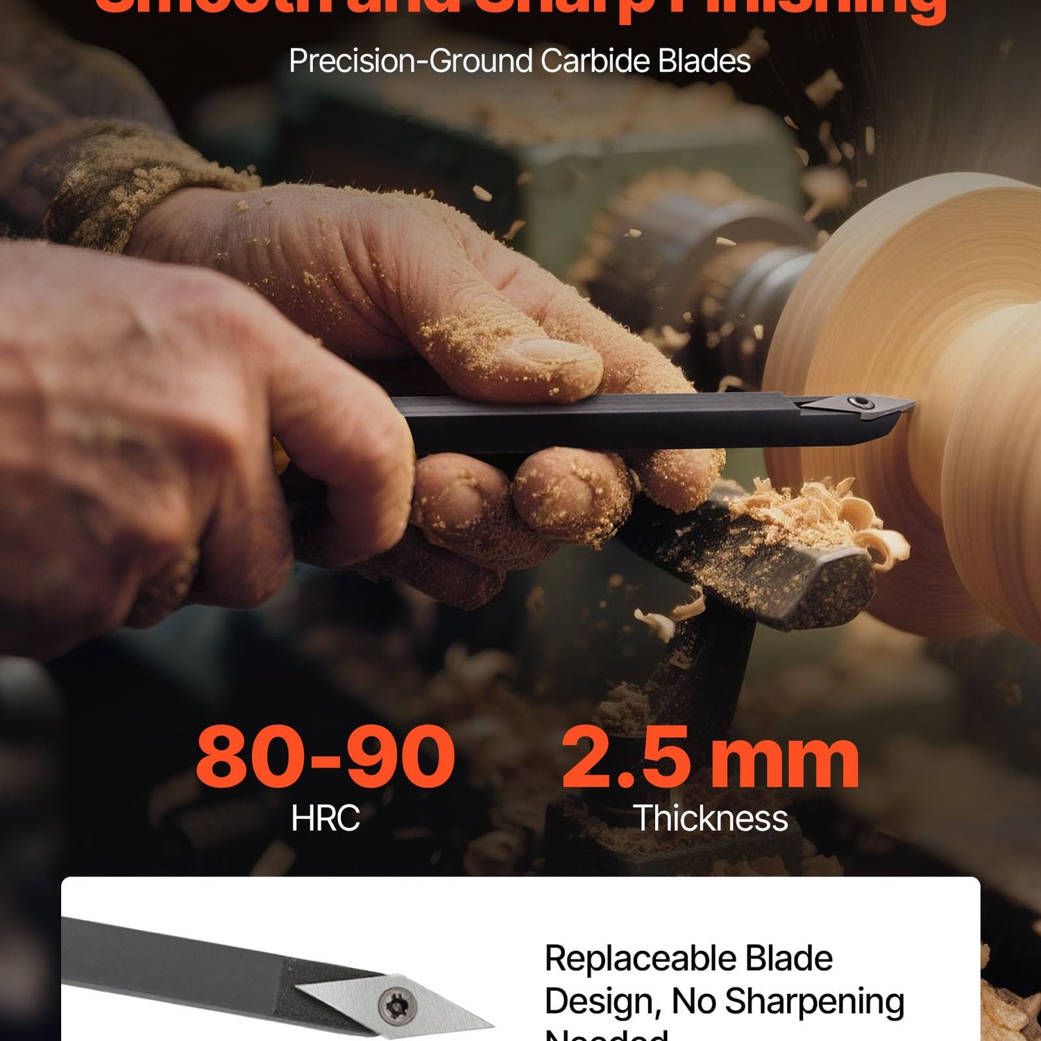 - Master Job with 4-Piece Tool Set: Our wood lathe chisel set includes 2 round blades (Φ12 x 2.5 mm), 1 square blade (11 x 11 mm), and 1 diamond blade (10 x 30 mm). The replaceable blades require no sharpening, making your woodworking project easy