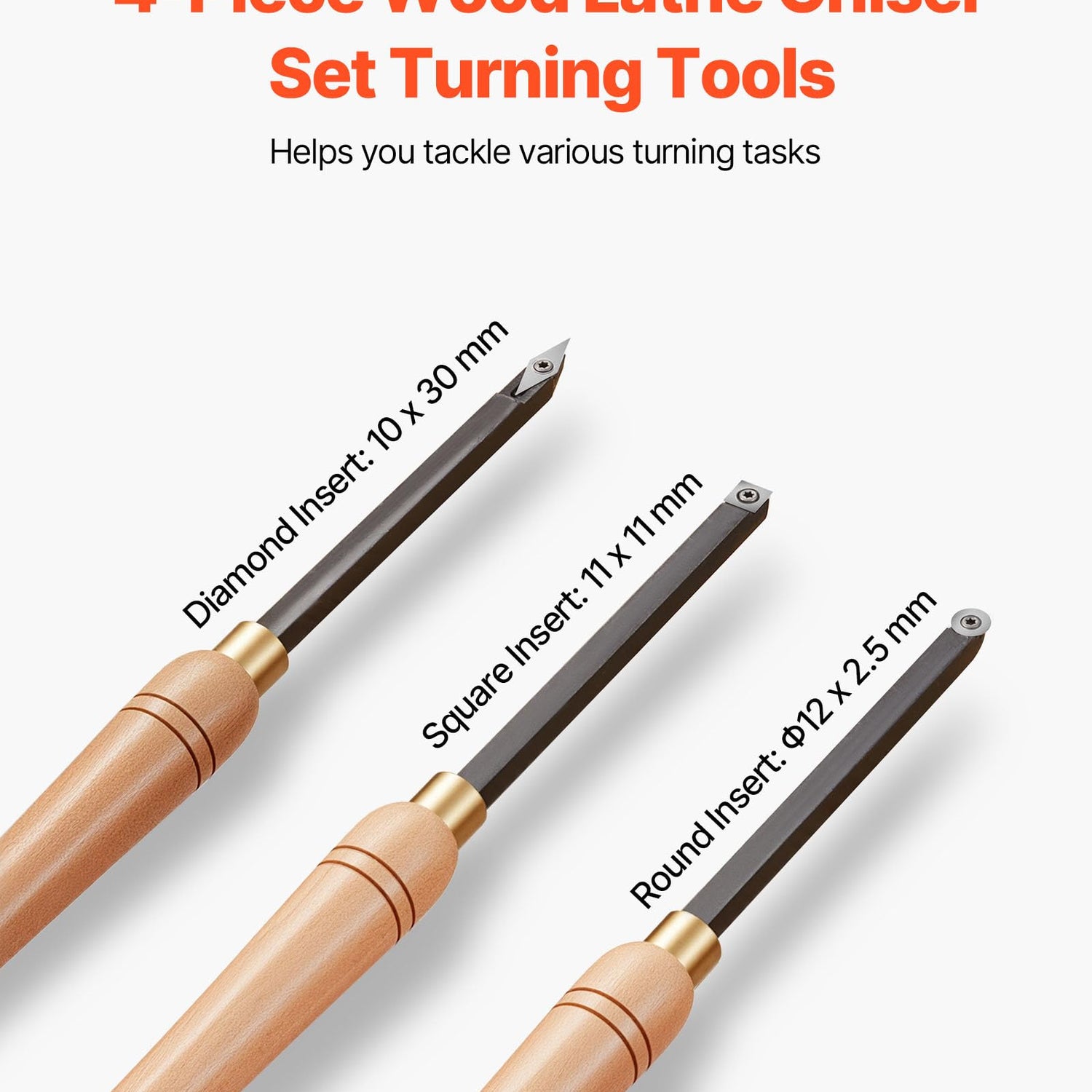 VEVOR Wood Lathe Turning Tool Set, 4PCS Lathe Roughing Finishing and Detailing Hollow Tool with Wooden Handle Diamond Round Square Carbide Inserts Wooden Box for Beginners Hobbyists Professionals