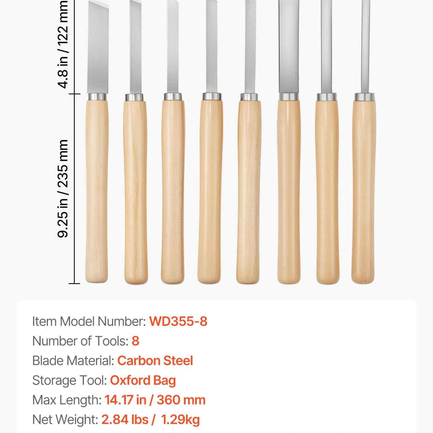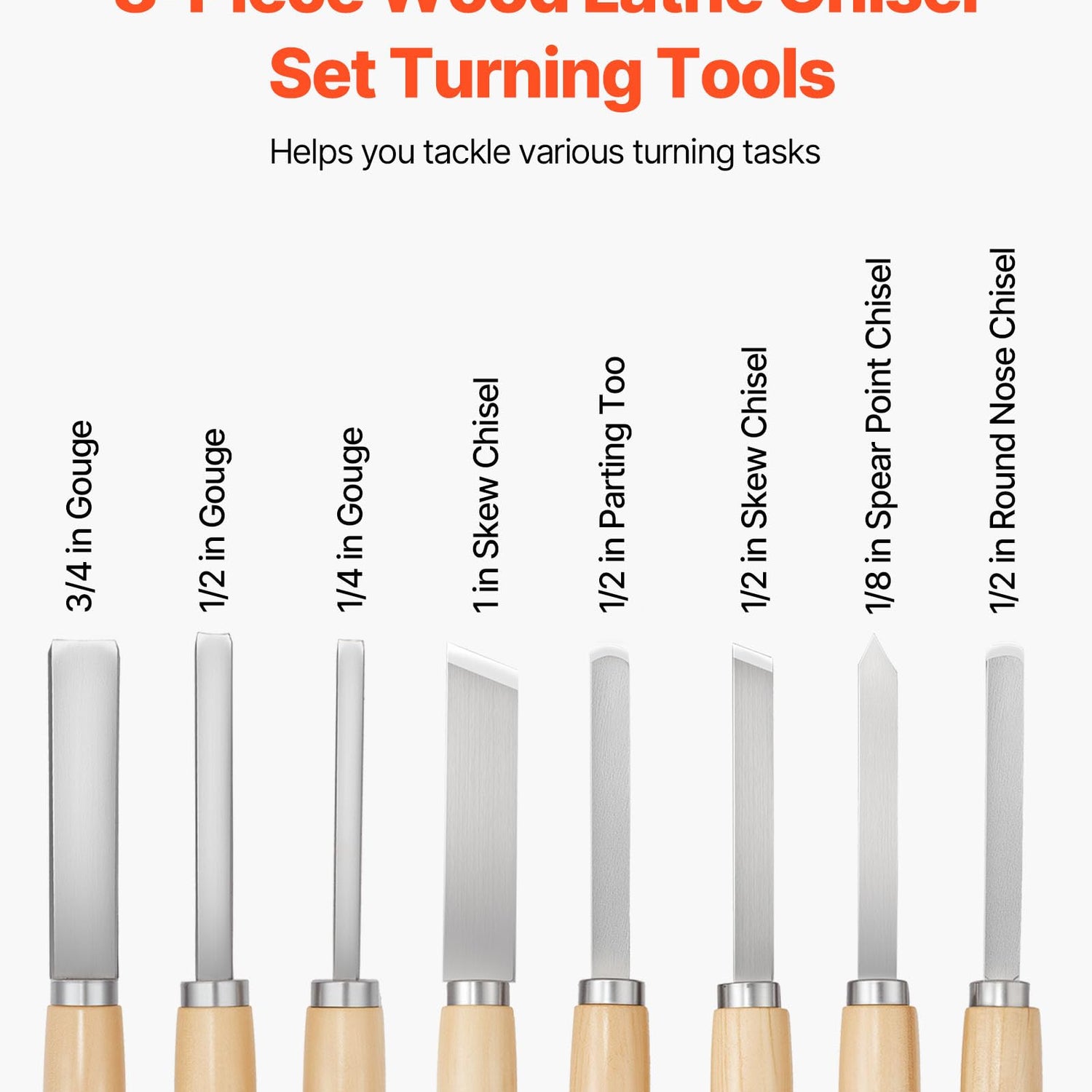 VEVOR Wood Lathe Turning Tool Set, 8PCS, Lathe Chisel Set with Carbon Steel Blade, 2 Skew, 1 Spear Point, 1 Parting, 1 Round Nose, 3 Gouge Tools, 1 Oxford Bag, for Beginners, Hobbyists, Professionals