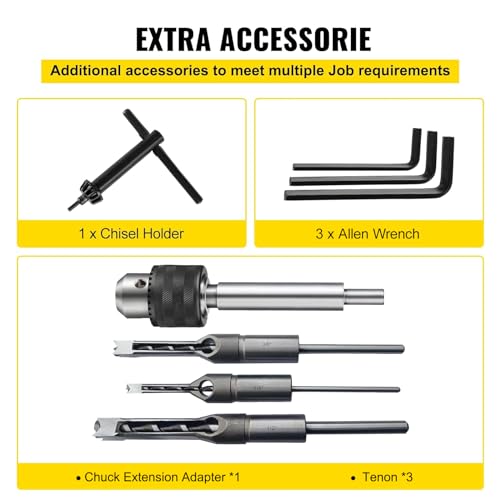 - All-purpose Use: This multifunctional mortise and tenon machine don't only cut wooden mortises into shapes such as circles, squares, and special squares but also can be used for circular grooves, internal grinding, and metal drilling, etc. Create intricate designs and detail like never before.