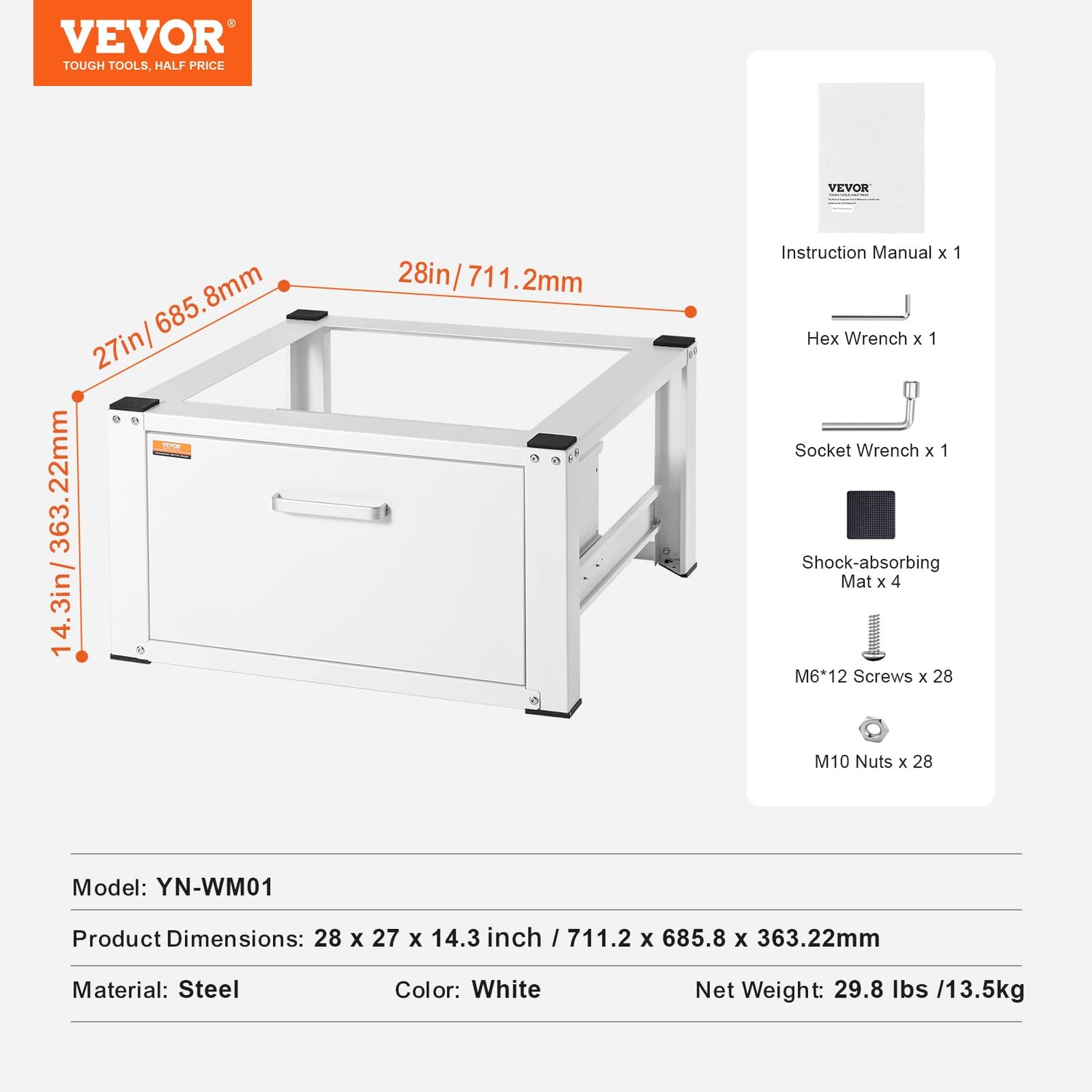 VEVOR YN-WM01 Laundry Pedestal Washer and Dryer Stand Platform Universal Fit 660lbs Capacity, Heavy Duty Multi-Functional Base for Washing Machine with Drawer & Rich Accessories, White