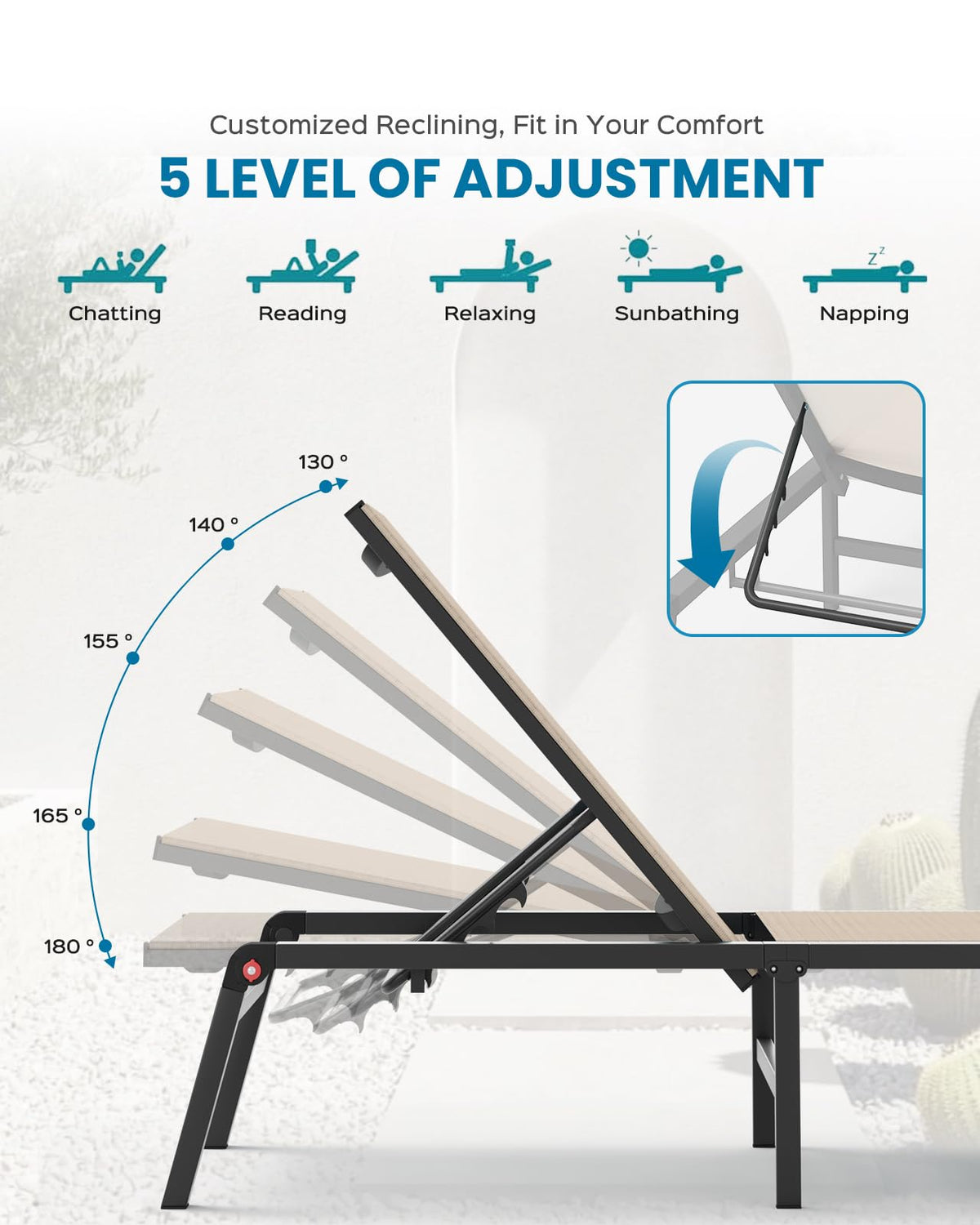 - 5-Position Adjustable Backrest –Experience ultimate comfort with our patio lounge chair’s five recline options. Whether you’re reading, napping, or simply relaxing, adjust the backrest from upright to fully reclined to find your perfect angle