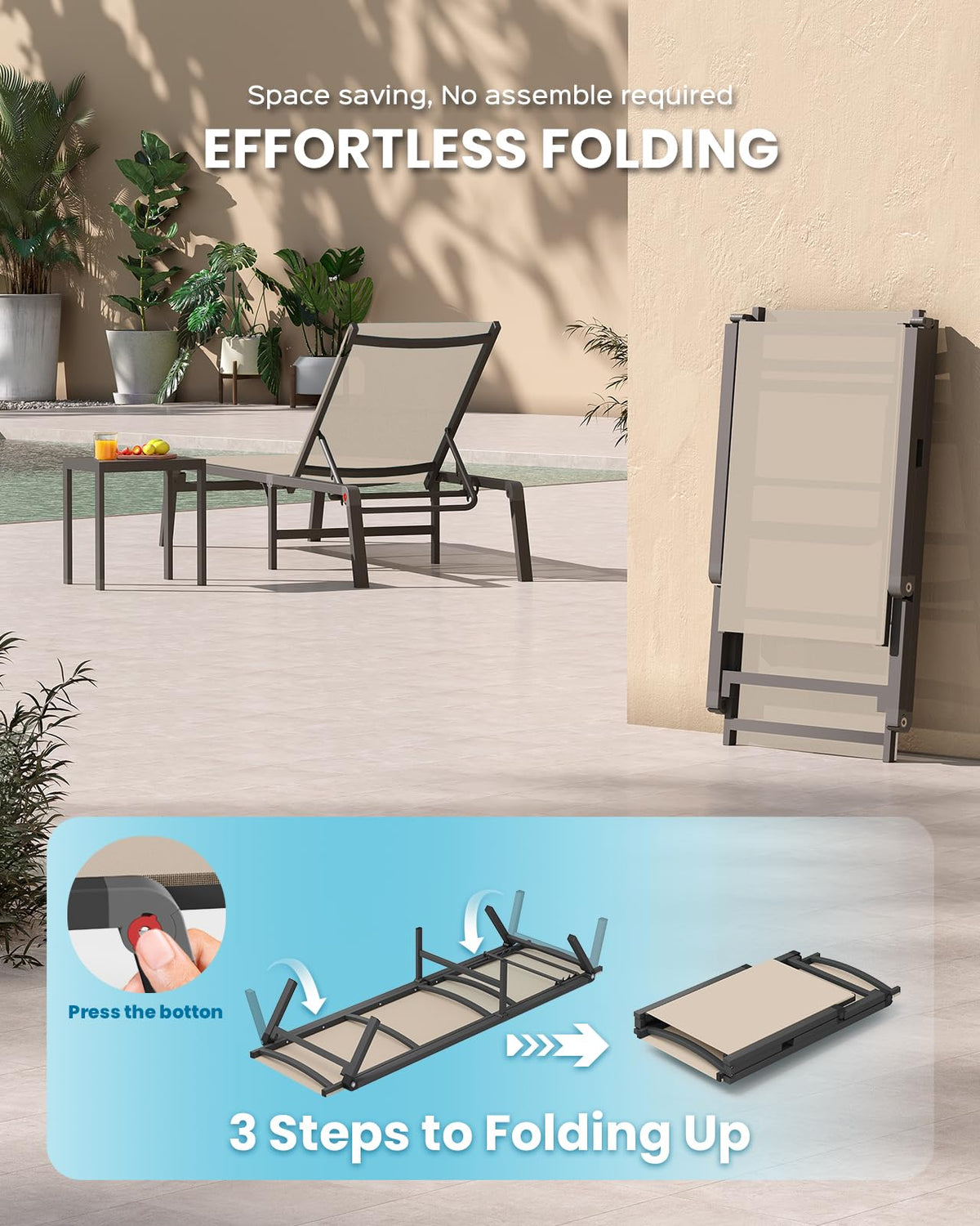 Vexwalx Chaise Lounge Outdoor, Foldable Aluminum Pool Lounge Chairs with 5 Positions Recliner - Free Assembly - Patio Chaise Lounge Chair for Poolside, Beach, Yard (Khaki)