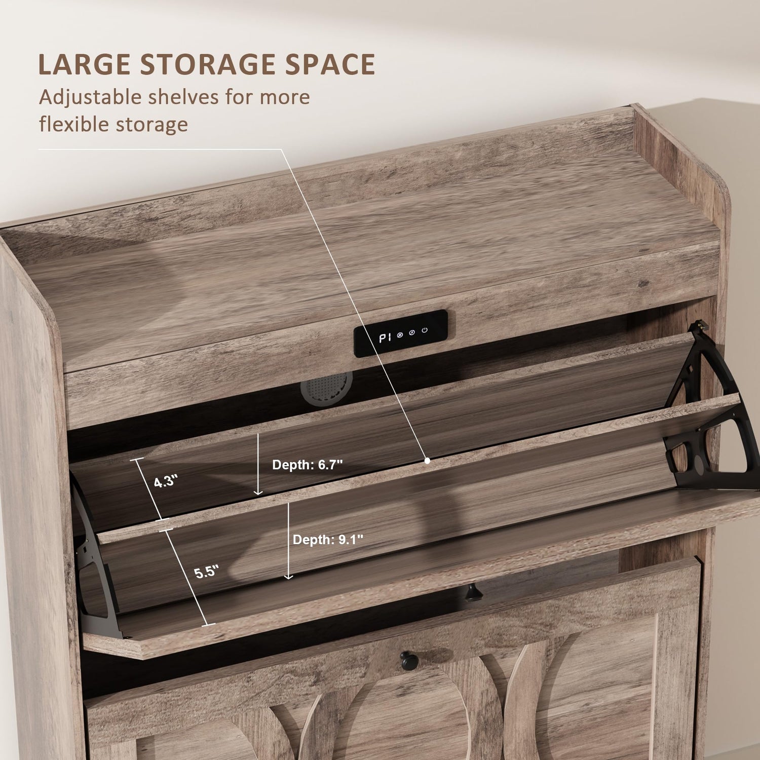 - 【Advanced Shoe Cabinet】Enjoy a smart shoe cabinet that helps maintain a clean storage environment for your shoes. Featuring an easy-to-use LED touchscreen, it keeps your shoes fresh and in optimal condition. The vented back panel prevents moisture buildup, ensuring a hygienic space for your footwear. Choose from four timed modes for effortless operation.