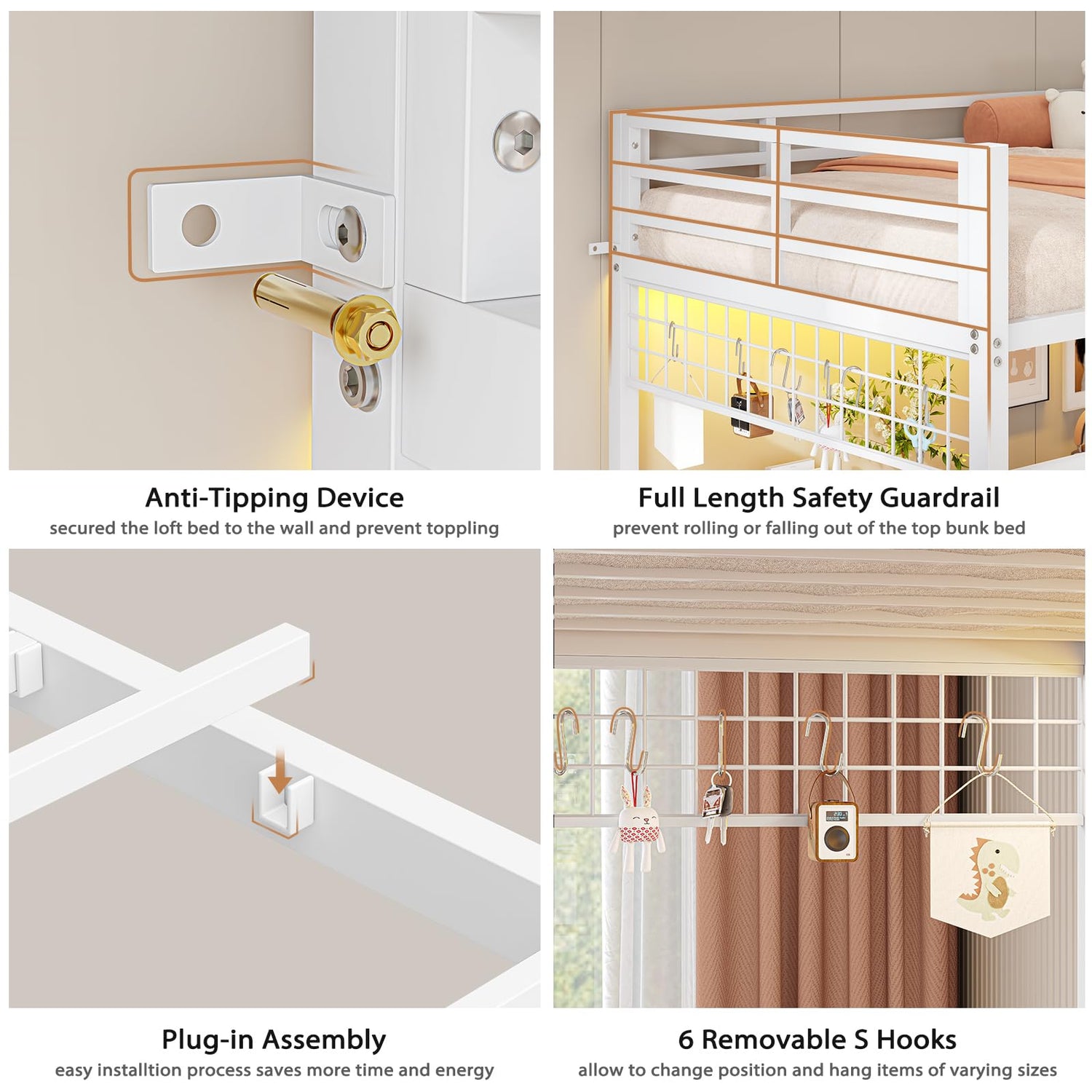 - 【Heavy Duty Metal Construction】Engineered from heavy-duty, all-steel construction, this bunk bed with storage offers rock-solid stability and durability. This twin bunk beds for kids features a robust anti-tip kit for secure wall anchoring, creating an ultra-stable fortress you can trust completely. Bubble pads on the ladder ensure safety and comfort during ascent and descent.