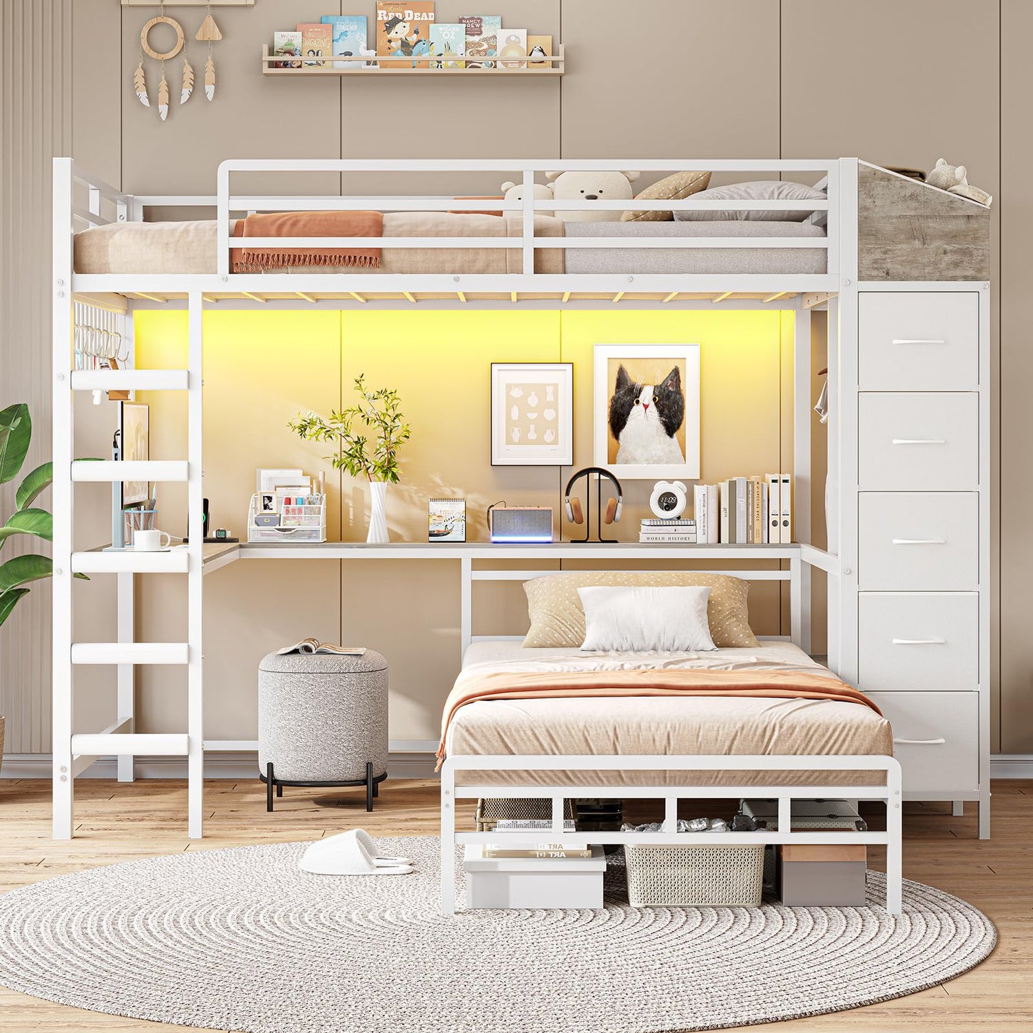 VIAGDO Bunk Bed Twin Over Twin with Hall Tree, Charging Station and LED Lights, L-Shaped Bunk Bed with Desk, 5 Storage Drawers, Twin Bunk Beds with Guardrail & Stairs, No Box Spring Needed, White