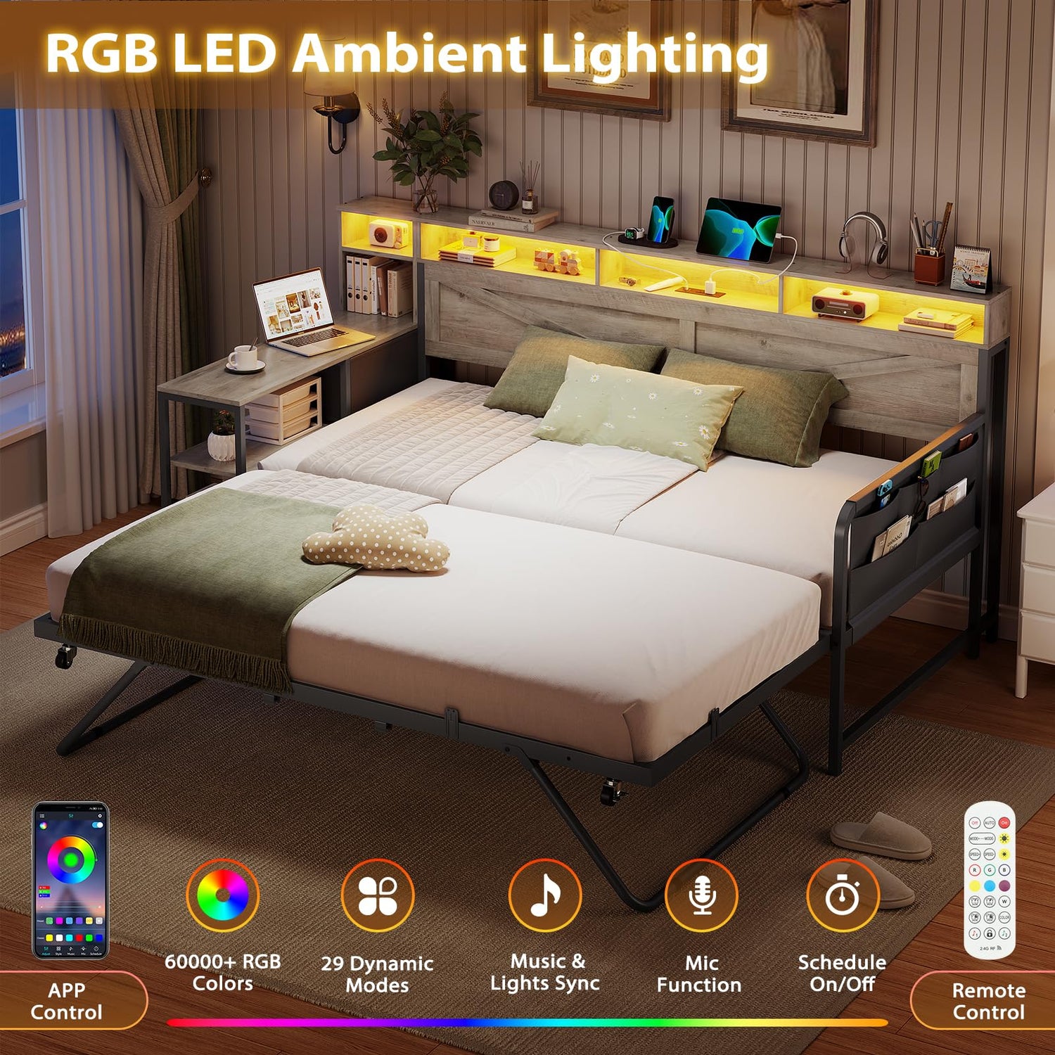 - 【Dynamic RGB LED Ambient Lighting】Let’s have some fun with the customized RGB LED daybed with trundle. Providing over 60000 fancy RGB colors, 29 dynamic modes, schedule on/off, mic and timing function, dual control by remote or phone APP. It can be used as a nightlight to cast away darkness or a dynamic lighting show for home concert or pajama party.