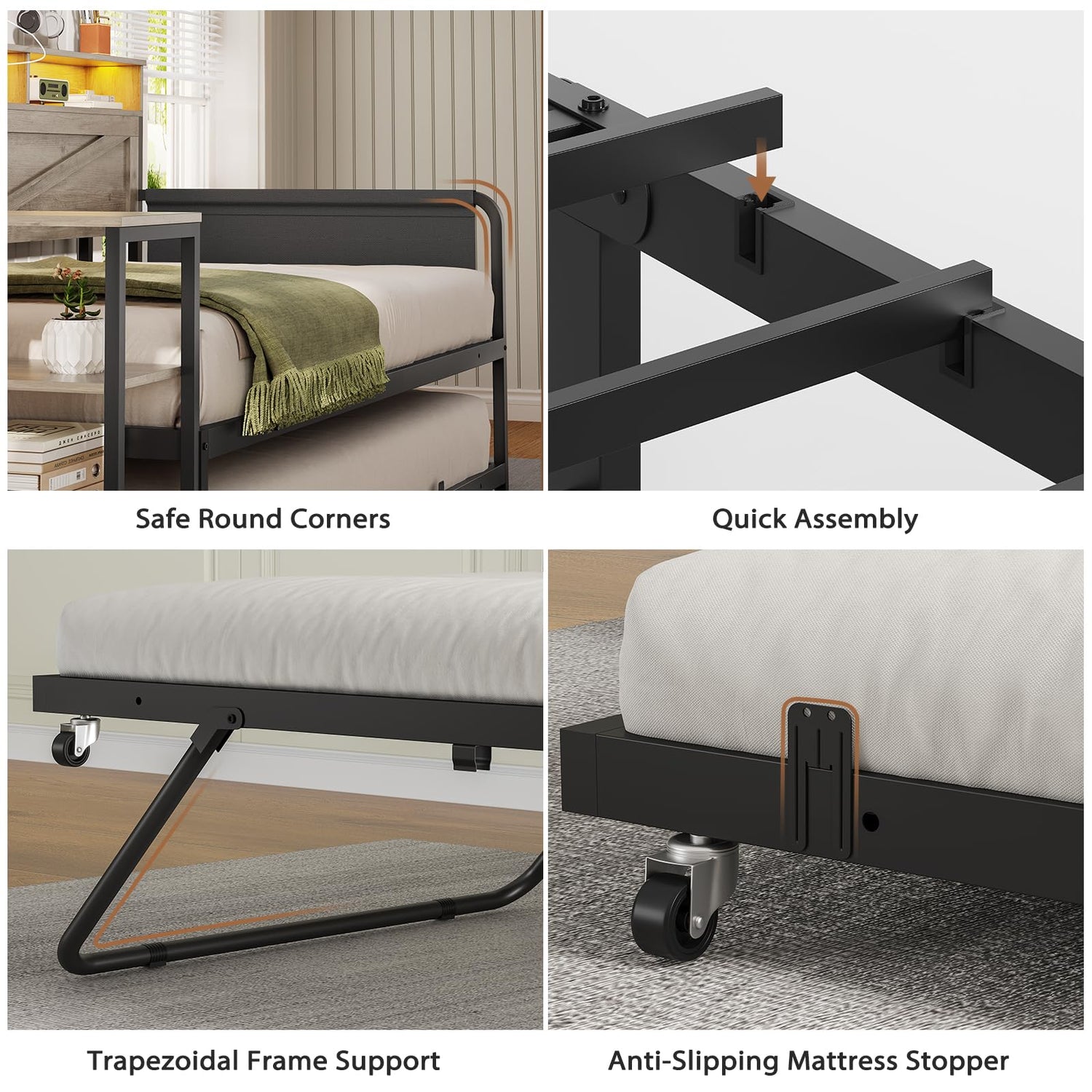 - 【Sturdy Construction and Easy Assembly】Constructed with premium MDF boards and robust metal frame, this farmhouse wood daybed with trundle bed twin ensures stability and durability. All woods are FSC-certified. The evenly distributed metal slats and bonus 8 pieces of mattress stopper can keep it in place. Package comes with labeled parts and tools, you can complete installation by following the manual or video. Please feel free to contact us if any questions about our led day bed.