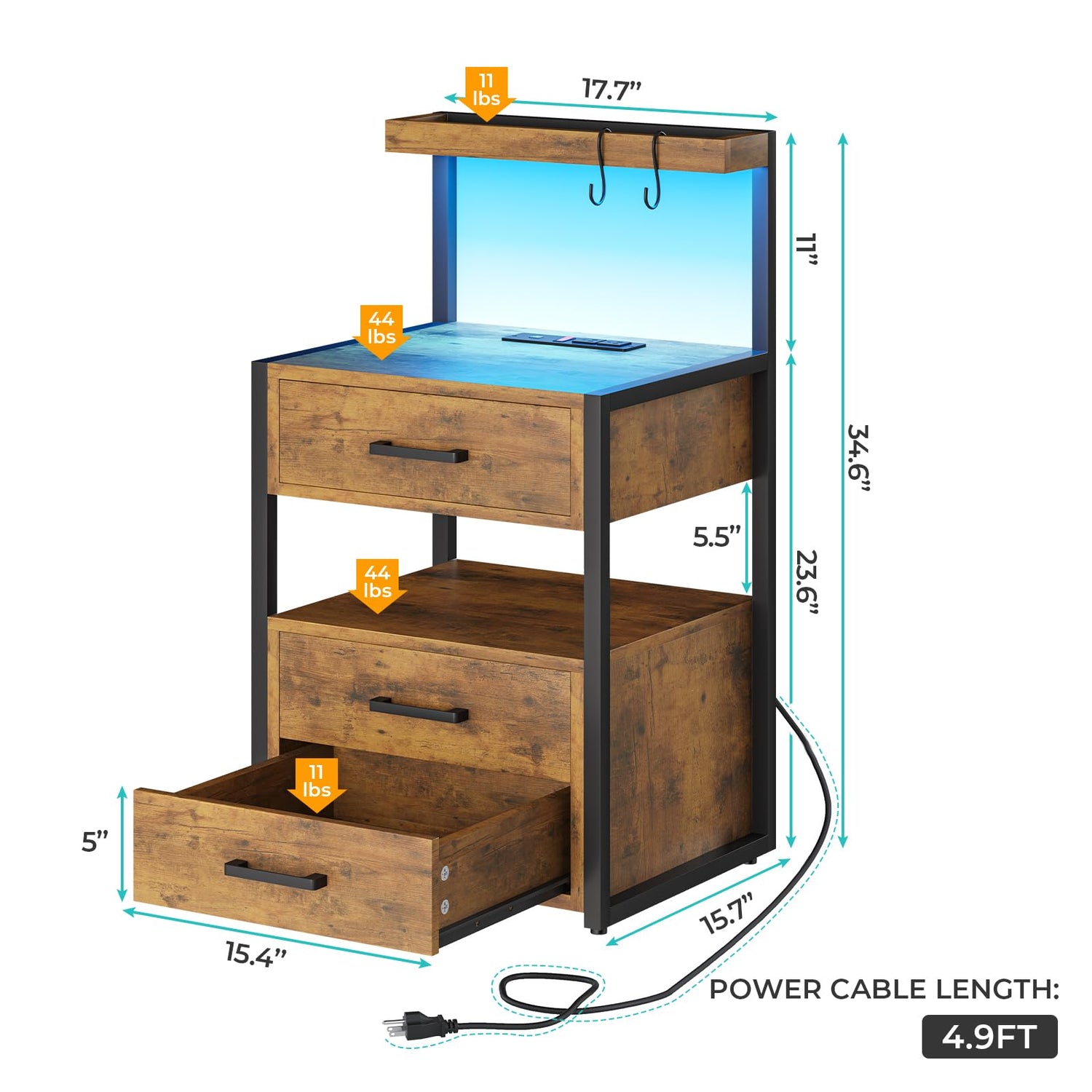 VIAGDO Led Nightstand with Charging Station, 3 Drawers Night Stands with Led Lights, Rustic Brown Bedside Tables with Storage Shelves, Modern End Side Tables for Bedroom, Office