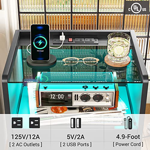 VIAGDO Nightstand with Charging Station and LED Lights, Black Night Stand with Glass Top and Storage Drawers, End Side Tables with Pull-Out Tray and USB Ports, Modern Bedside Tables for Bedroom