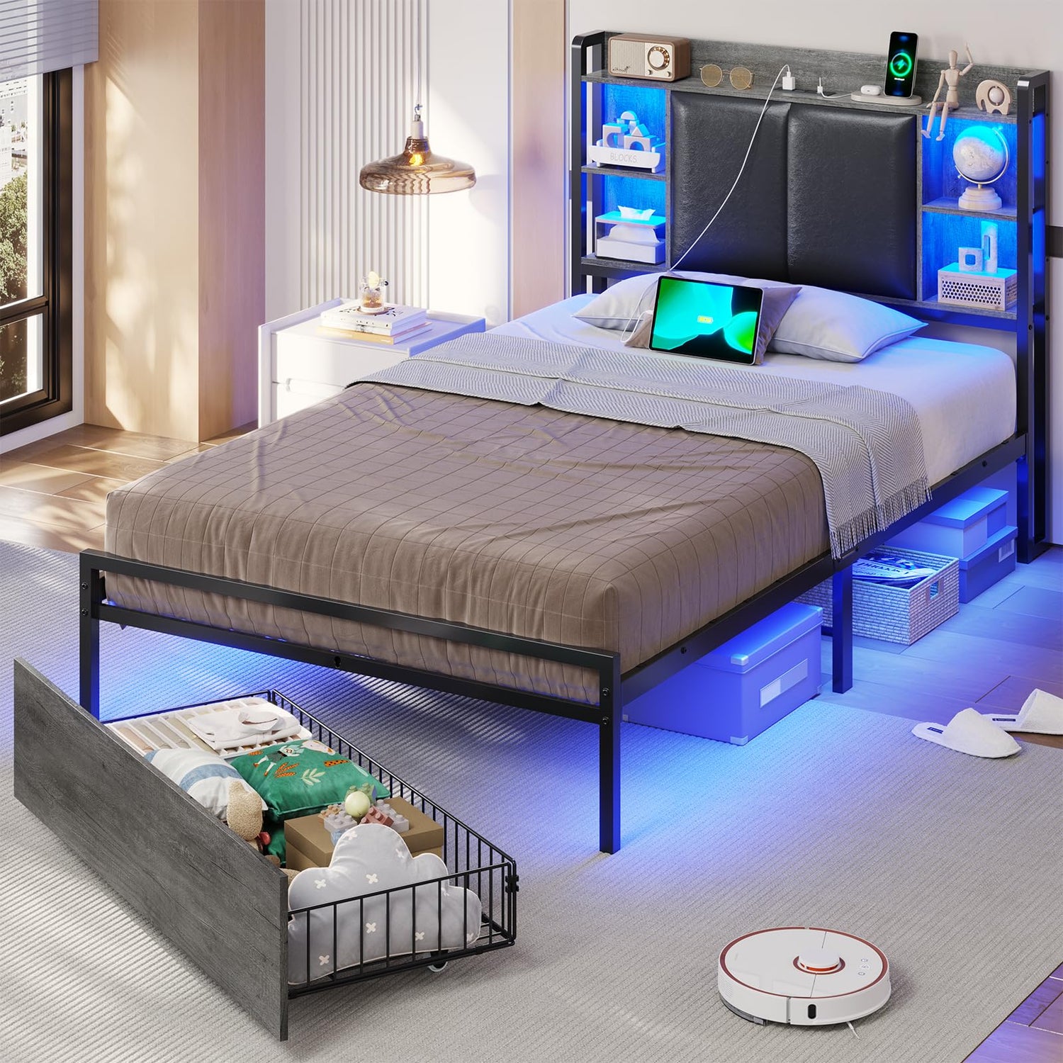 VIAGDO Twin Bed Frame with LED Lights, Upholstered Storage Headboard, Charging Station, and Drawers