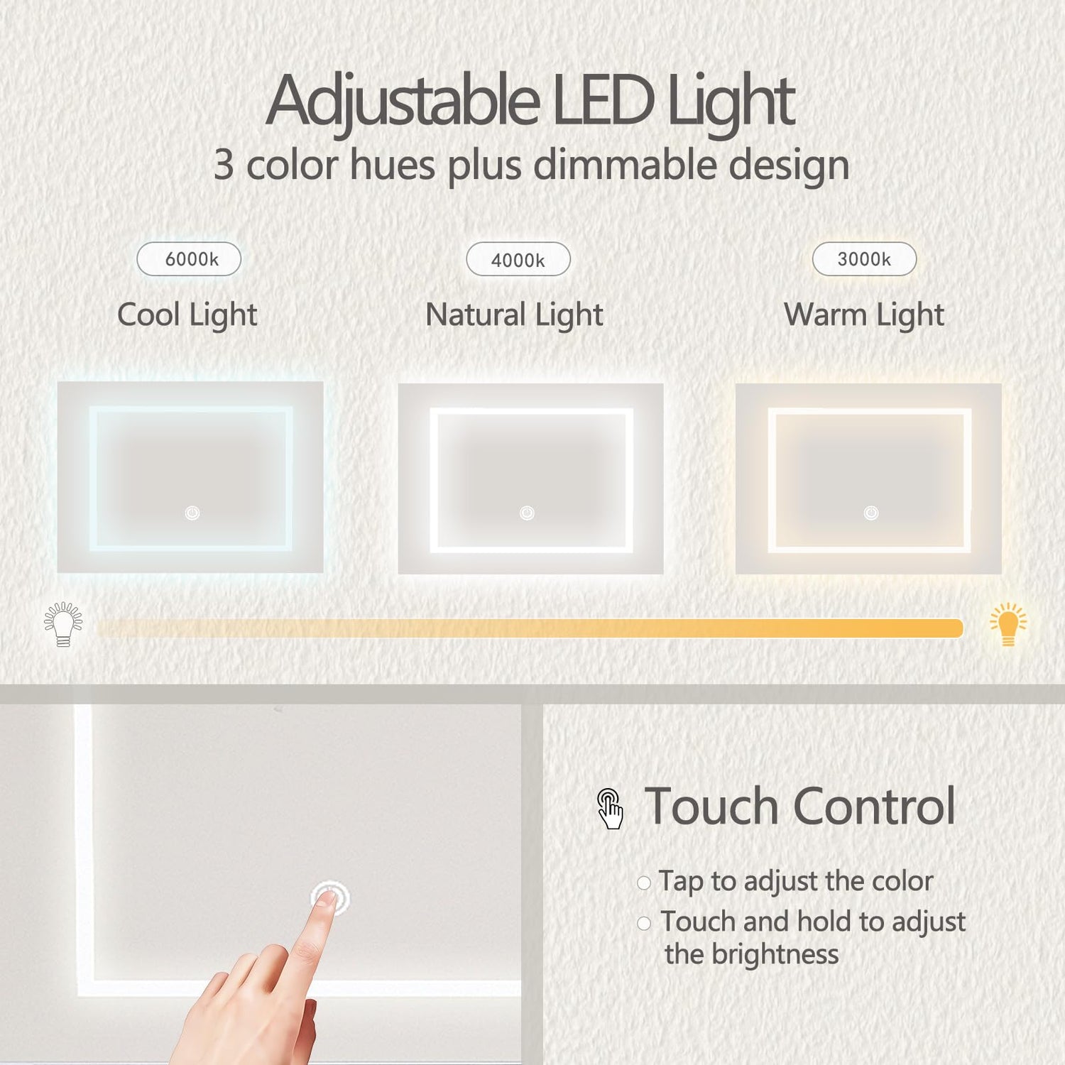 - 【DIMMABLE LED LIGHTING】This vanity with mirror features 3 professional lighting modes, providing perfect illumination for makeup application and styling. Easily switch color temperatures with a touch, or hold to dim—creating a customizable ambiance for any occasion.