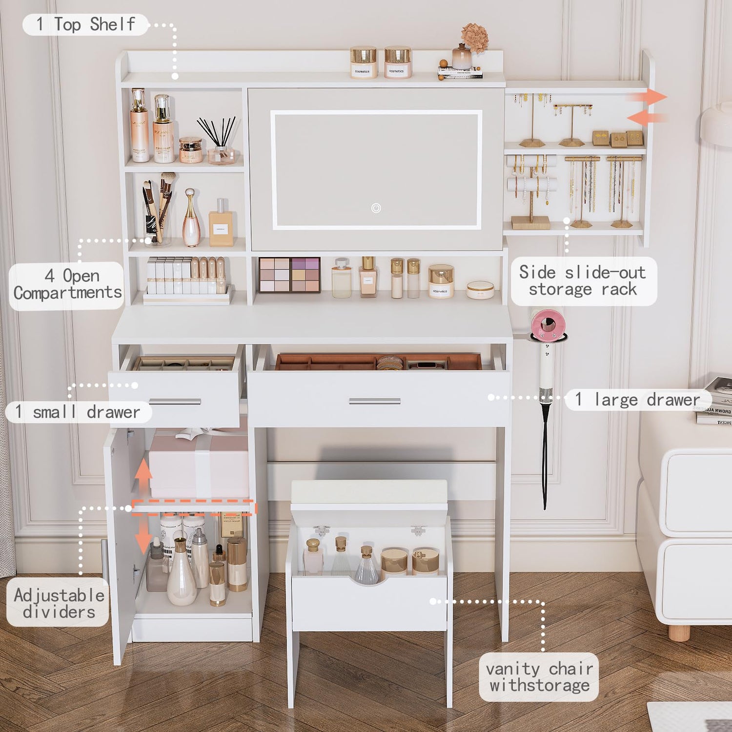 Viaozutis Vanity Desk with Mirror and Lights, with Hidden Shelves,4 Compartments,2 Drawers,Cabinet & Stool,Dimmable LED Lights,Power Outlets, Ideal for Bedroom Vanity Organization(White)