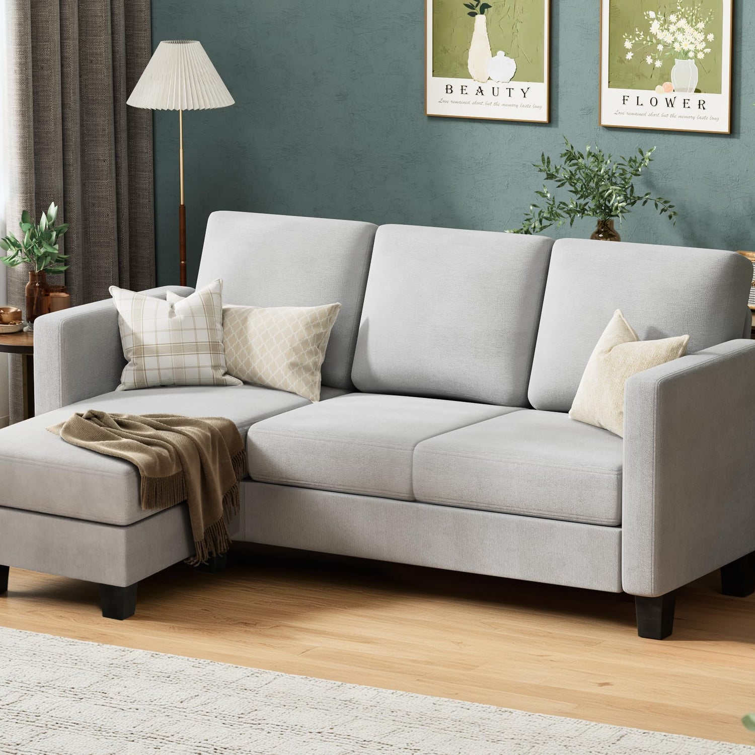 - [Comfortable & Soft Convertible Sectional Sofa] Made of high-density sponge, covered with breathable soft linen fabric, the high-resilience couch will provide you comfortable and soft cloud touch experience. The cushions are vacuum-packed. Thus, in order to get the best experience, please wait 48 hours to let it become the original shape