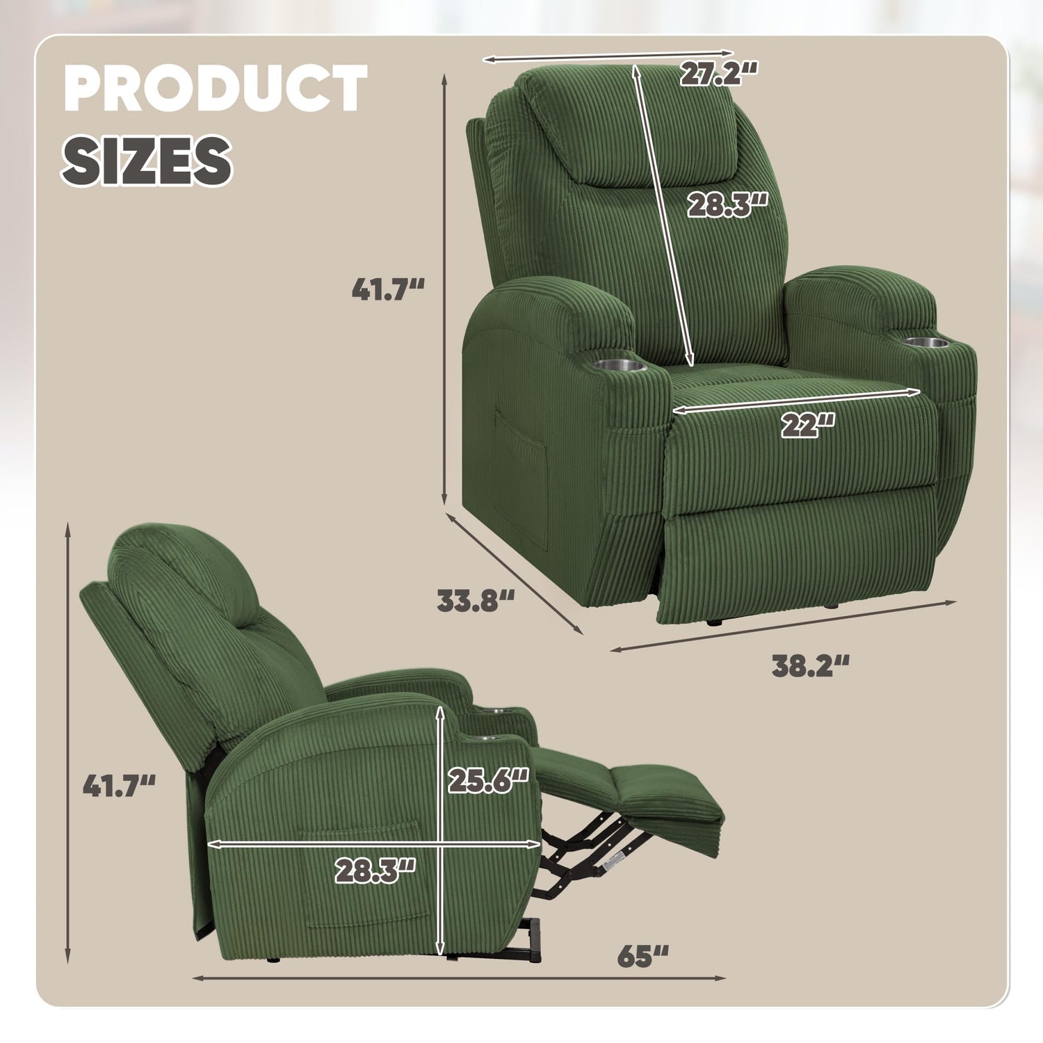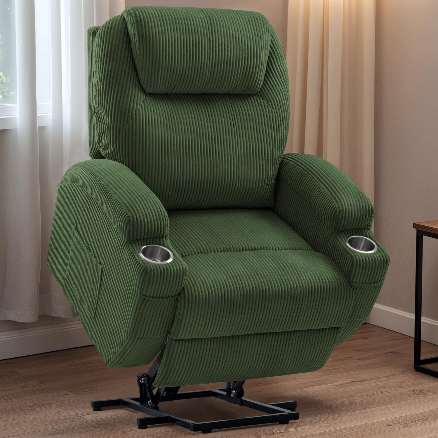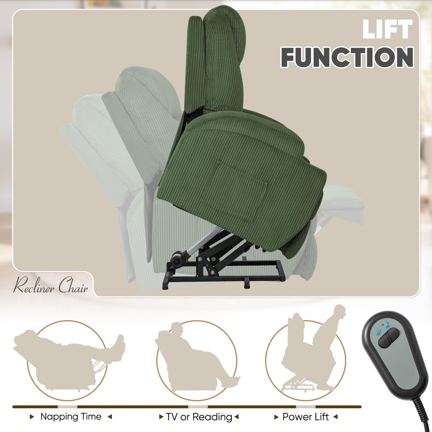 VICTONE Electric Power Lift Recliner Chair for Elderly Reclining Sofa for Living Room with Massage, Side Pockets and Cup Holders (Corduroy, Green)