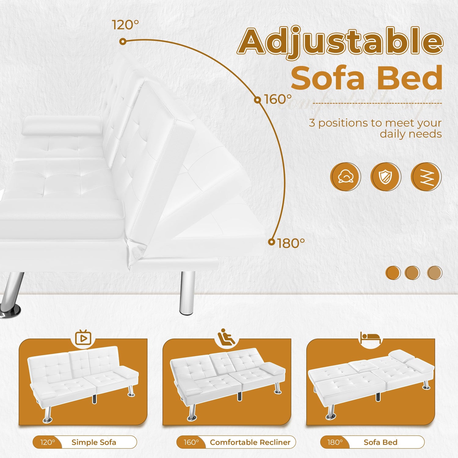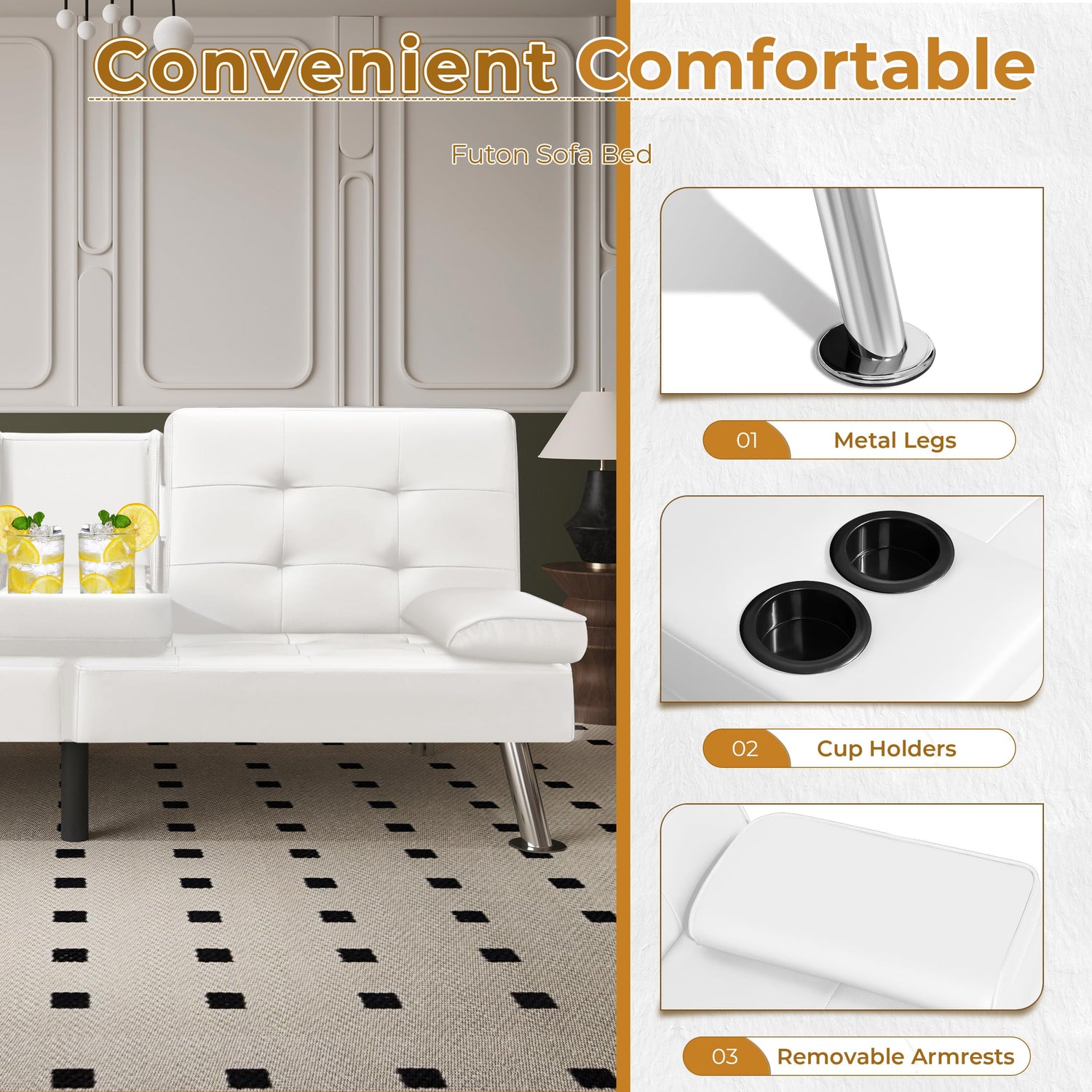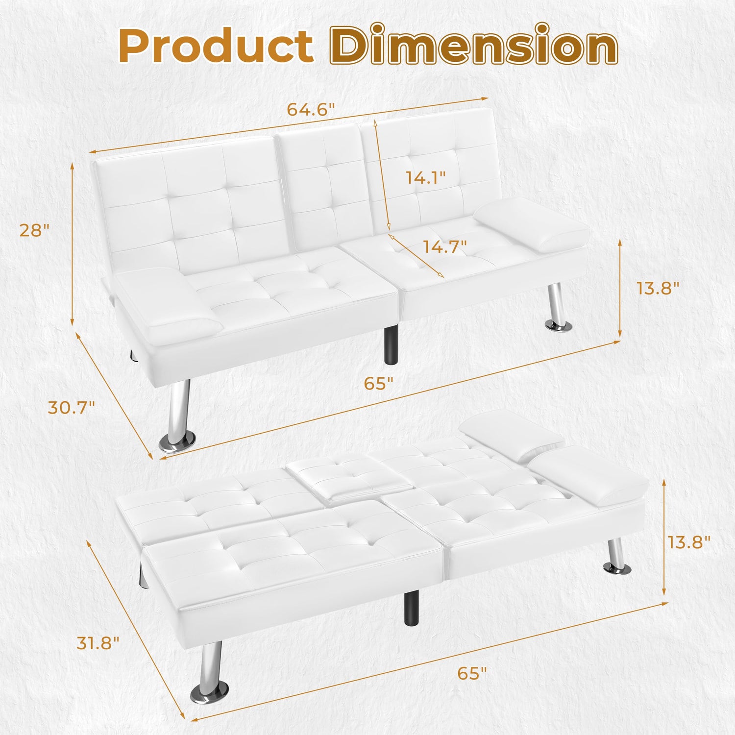 VICTONE Futon Sofa Bed Modern Faux Leather Couch Bed Convertible Folding Recliner for Living Room with 2 Cup Holders and Armrest (White)
