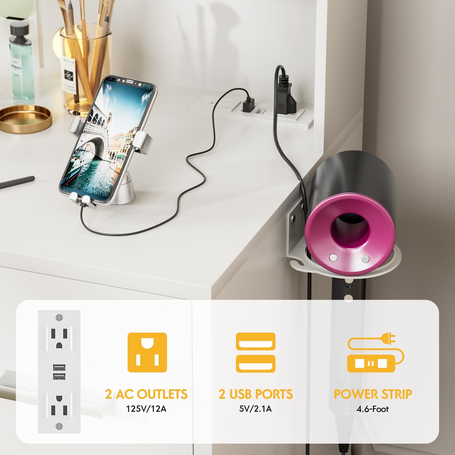 - [Convenient Power Strips & Hair Dryer Rack] The vanity is equipped with a built-in charging station, including two AC outlets and 2 USB ports, through which you can charge and use electronic devices at the same time. In addition, our vanity desk provides you with a hair dryer rack to keep your hair dryer and hair curler within arm’s reach.