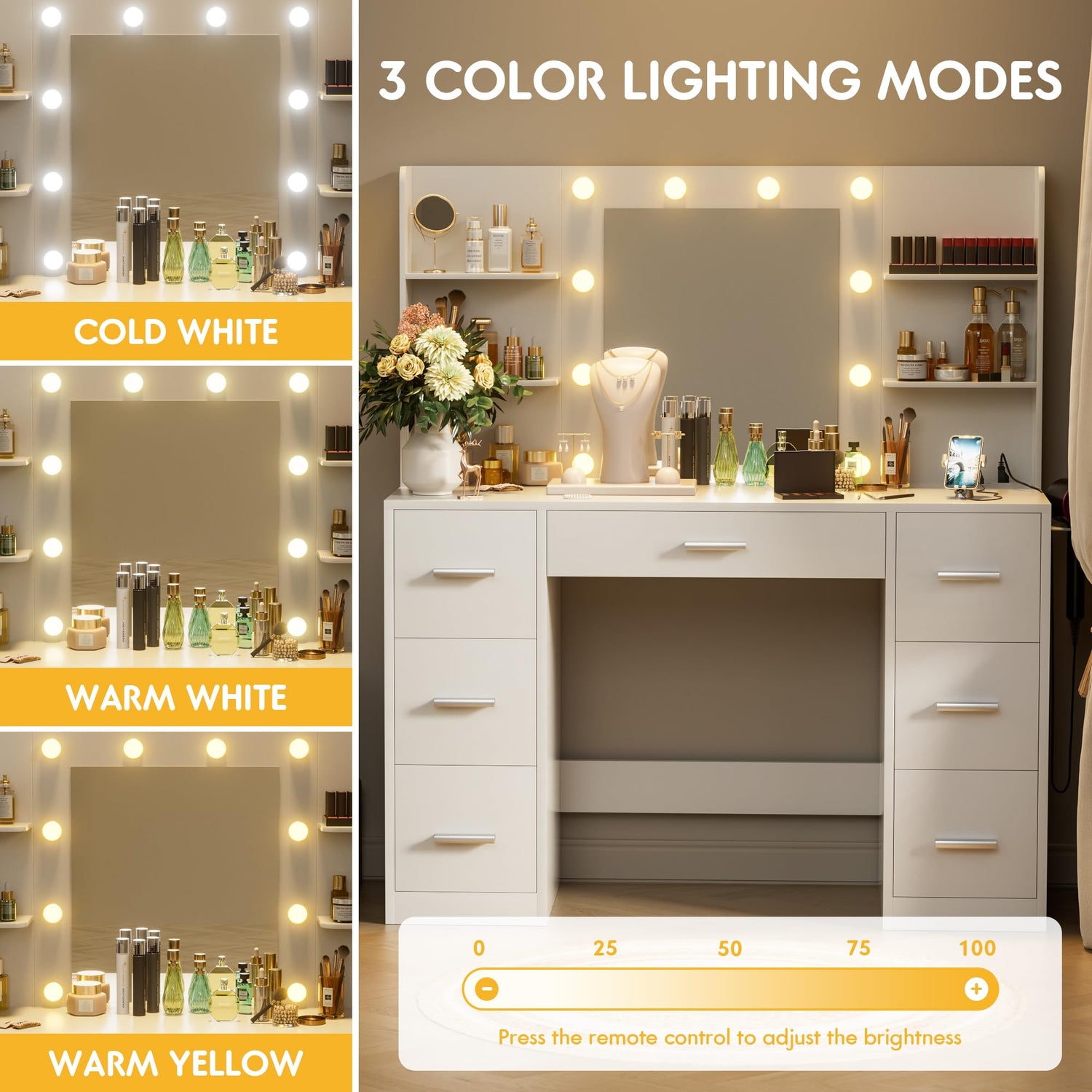 - [Vanity Table with Mirror and Lights] A clear mirror is an essential part of a good dressing and makeup vanity. Our vanity desk features an LED-lighted clear mirror. 10 LED lights have 3 adjustable models(cold white/warm white/warm yellow). You can choose the suitable one when you’re putting on makeup or taking a picture, which will better illuminate your beauty.