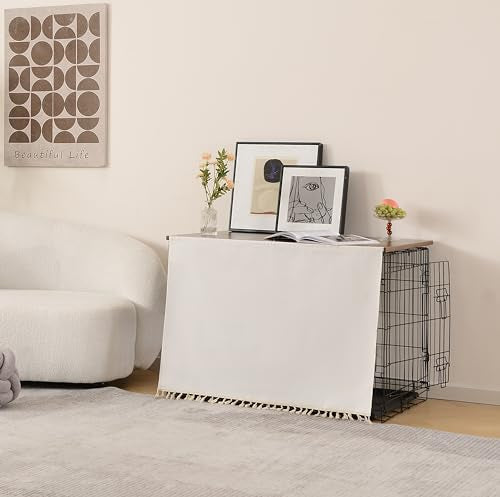 Details: AMAN Dog crate topper wood for 48 42 36 24 inch cages , Dog crate table topper with tassel curtain, Rustic style dog kennel topper