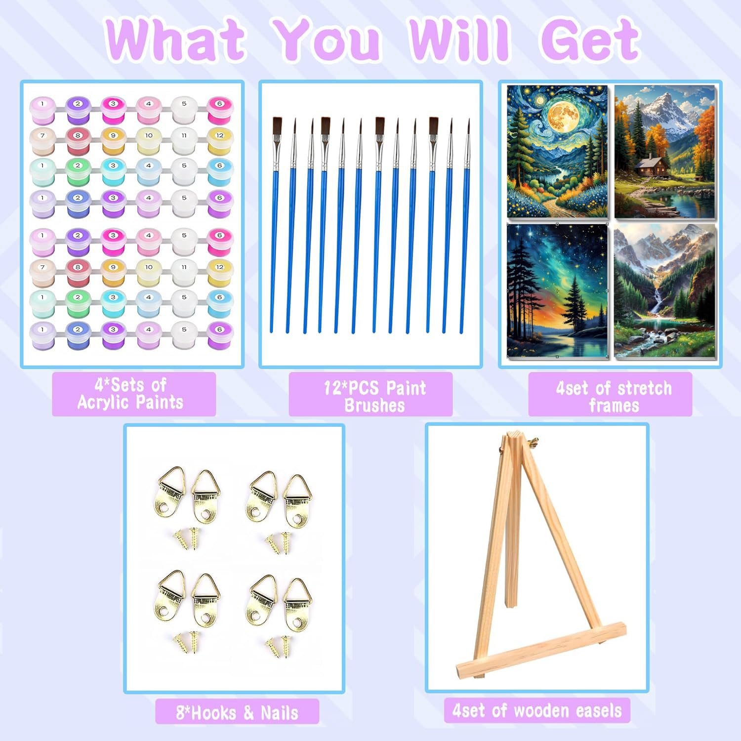 - 【What You Will Get】4 pre-printed canvas with Frame, 4 set of acrylic paint,1 Wooden Easel,8 high-quality brushes, 4 paper copy of numbered canvas for reference, 8 metal hanger.
